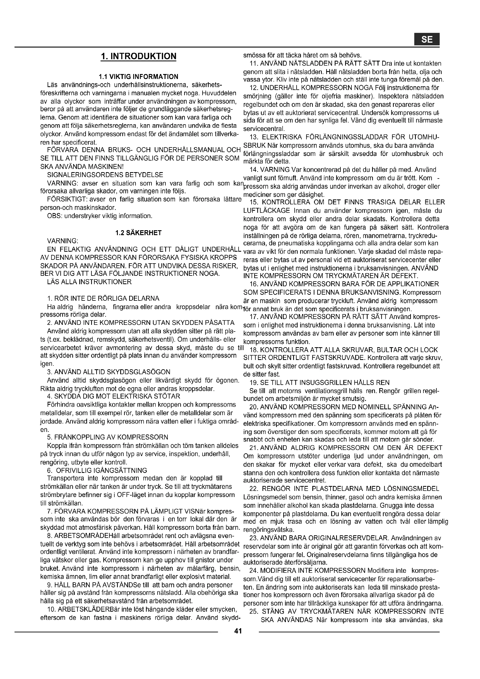 Läs användnings-och underhållsinstruktionerna, säkerhets- föreskrifterna och varningarna i manualen mycket noga. Huvuddelen av alla olyckor som inträffar under användningen av kompressorn, beror på att användaren inte följer de grundläggande säkerhetsreg-