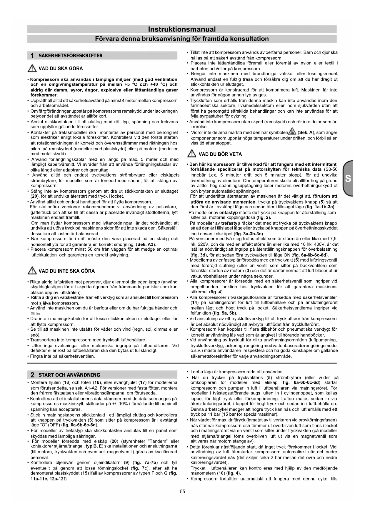 - Rikta aldrig luftstrålen mot personer, djur eller mot din egen kropp (använd skyddsglasögon för att skydda ögonen från främmande partiklar som kan blåsas upp av luftstrålen).• Rikta aldrig en vätskestråle från ett verktyg som är anslutet till kompressorn mot själva kompressorn.• Använd inte maskinen om du är barfota eller om du har fuktiga händer och fötter.• Dra inte i matningskabeln för att lossa stickkontakten ur eluttaget eller för att flytta kompressorn.• Se till att maskinen inte utsätts för väder och vind (regn, sol, dimma eller snö).• Transportera inte kompressorn med trycksatt luftbehållare.• Utför inga svetsningar eller mekaniska ingrepp på luftbehållaren. Vid defekter eller rost på luftbehållaren ska den bytas ut fullständigt.• Fingra inte på säkerhetsventilen.• Tillåt inte att kompressorn används av oerfarna personer. Barn och djur ska hållas på ett säkert avstånd från kompressorn.• Placera inte lättantändliga föremål eller föremål av nylon eller textil i närheten och/eller på kompressorn.• Rengör inte maskinen med brandfarliga vätskor eller lösningsmedel. Använd endast en fuktig trasa och försäkra dig om att du har dragit ut stickkontakten ur eluttaget.• Kompressorn är konstruerad för att komprimera luft. Maskinen får inte användas för någon annan typ av gas.• Tryckluften som erhålls från denna maskin kan inte användas inom den farmaceutiska sektorn, livsmedelssektorn eller inom sjukvården utan att först ha genomgått särskilda behandlingar och kan inte användas för att fylla syrgastuber för dykning.• Använd inte kompressorn utan skydd (remskydd) och rör inte delar som är i rörelse.• Vidrör inte delarna märkta med den här symbolen (Sek. A), som anger komponenter som uppnår höga temperaturer under driften, och förbli så en viss tid efter stoppet.