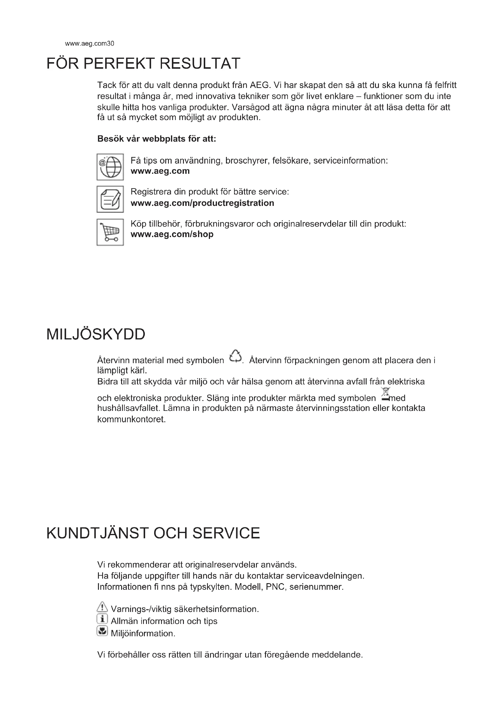 Vi rekommenderar att originalreservdelar används. Ha följande uppgifter till hands när du kontaktar serviceavdelningen. Informationen fi nns på typskylten. Modell, PNC, serienummer. Varnings-/viktig säkerhetsinformation. Allmän information och tips Miljöinformation. Vi förbehåller oss rätten till ändringar utan föregående meddelande.