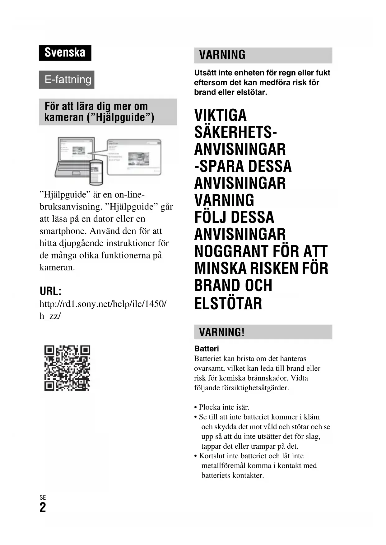BRAND OCH ELSTÖTAR BatteriBatteriet kan brista om det hanteras ovarsamt, vilket kan leda till brand eller risk för kemiska brännskador. Vidta följande försiktighetsåtgärder.• Plocka inte isär.• Se till att inte batteriet kommer i kläm och skydda det mot våld och stötar och se upp så att du inte utsätter det för slag, tappar det eller trampar på det.• Kortslut inte batteriet och låt inte metallföremål komma i kontakt med batteriets kontakter. Svenska E-fattning För att lära dig mer om kameran (”Hjälpguide”) VARNING VARNING!SE