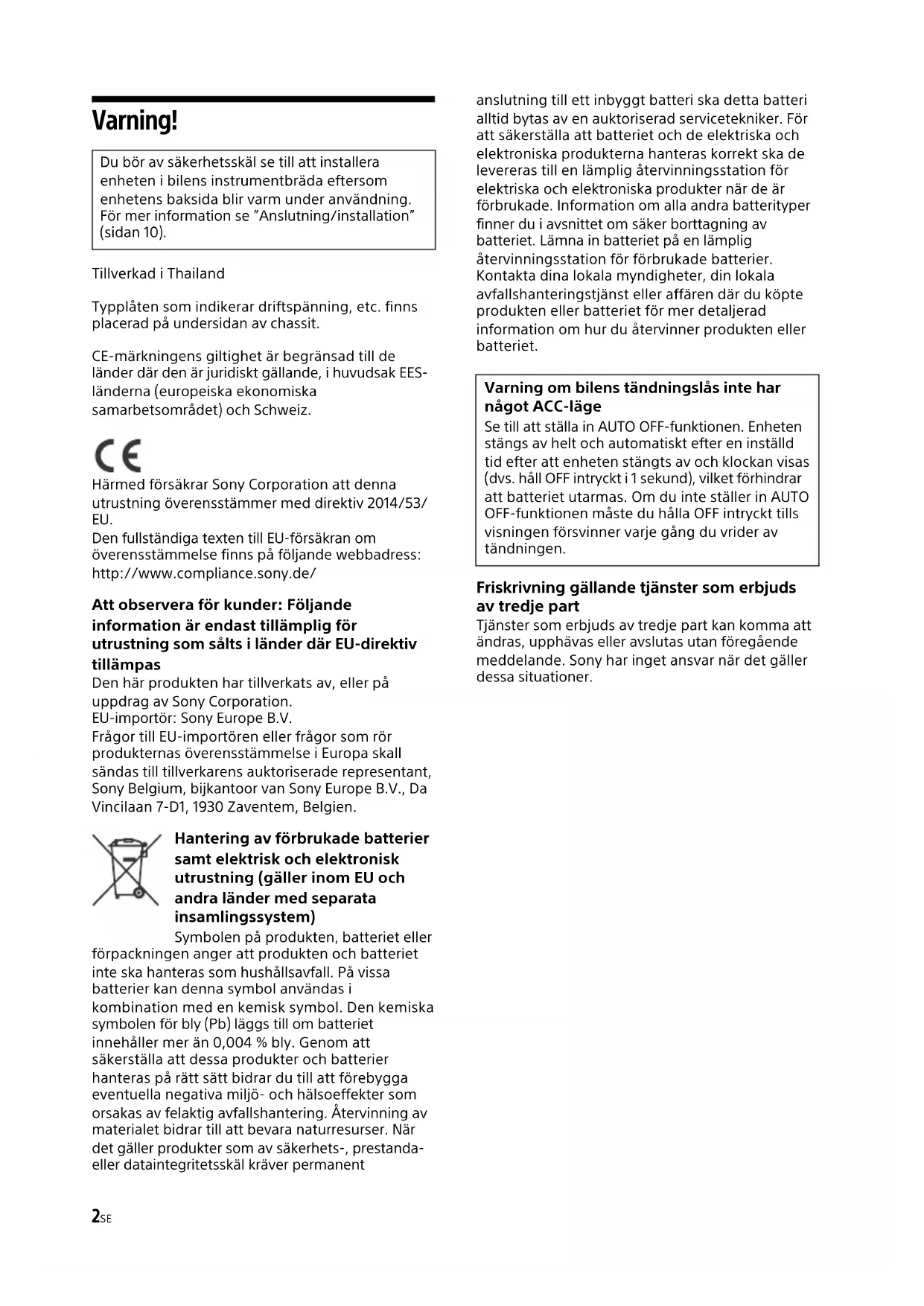 Naar dashboard/middenconsoleOnderdelen die bij uw auto worden geleverd BeugelBeugel Zekering (10 A)2SE Varning! Tillverkad i Thailand Typplåten som indikerar driftspänning, etc. finns placerad på undersidan av chassit. CE-märkningens giltighet är begränsad till de länder där den är juridiskt gällande, i huvudsak EES- länderna (europeiska ekonomiska samarbetsområdet) och Schweiz. Härmed försäkrar Sony Corporation att denna utrustning överensstämmer med direktiv 2014/53/ EU. Den fullständiga texten till EU-försäkran om överensstämmelse finns på följande webbadress: http://www.compliance.sony.de/ Att observera för kunder: Följande information är endast tillämplig för utrustning som sålts i länder där EU-direktiv tillämpas Den här produkten har tillverkats av, eller på uppdrag av Sony Corporation. EU-importör: Sony Europe B.V. Frågor till EU-importören eller frågor som rör produkternas överensstämmelse i Europa skall sändas till tillverkarens auktoriserade representant, Sony Belgium, bijkantoor van Sony Europe B.V., Da Vincilaan 7-D1, 1930 Zaventem, Belgien. Hantering av förbrukade batterier samt elektrisk och elektronisk utrustning (gäller inom EU och andra länder med separata insamlingssystem) Symbolen på produkten, batteriet eller förpackningen anger att produkten och batteriet inte ska hanteras som hushållsavfall. På vissa batterier kan denna symbol användas i kombination med en kemisk symbol. Den kemiska symbolen för bly (Pb) läggs till om batteriet innehåller mer än 0,004 % bly. Genom att säkerställa att dessa produkter och batterier hanteras på rätt sätt bidrar du till att förebygga eventuella negativa miljö- och hälsoeffekter som orsakas av felaktig avfallshantering. Återvinning av materialet bidrar till att bevara naturresurser. När det gäller produkter som av säkerhets-, prestanda- eller dataintegritetsskäl kräver permanent anslutning till ett inbyggt batteri ska detta batteri alltid bytas av en auktoriserad servicetekniker. För att säkerställa att batteriet och de elektriska och elektroniska produkterna hanteras korrekt ska de levereras till en lämplig återvinningsstation för elektriska och elektroniska produkter när de är förbrukade. Information om alla andra batterityper finner du i avsnittet om säker borttagning av batteriet. Lämna in batteriet på en lämplig återvinningsstation för förbrukade batterier. Kontakta dina lokala myndigheter, din lokala avfallshanteringstjänst eller affären där du köpte produkten eller batteriet för mer detaljerad information om hur du återvinner produkten eller batteriet. Friskrivning gällande tjänster som erbjuds av tredje part Tjänster som erbjuds av tredje part kan komma att ändras, upphävas eller avslutas utan föregående meddelande. Sony har inget ansvar när det gäller dessa situationer. Du bör av säkerhetsskäl se till att installera enheten i bilens instrumentbräda eftersom enhetens baksida blir varm under användning. För mer information se ”Anslutning/installation” (sidan 10). Varning om bilens tändningslås inte har något ACC-läge Se till att ställa in AUTO OFF-funktionen. Enheten stängs av helt och automatiskt efter en inställd tid efter att enheten stängts av och klockan visas (dvs. håll OFF intryckt i 1 sekund), vilket förhindrar att batteriet utarmas. Om du inte ställer in AUTO OFF-funktionen måste du hålla OFF intryckt tills visningen försvinner varje gång du vrider av tändningen.3SE Försiktighet