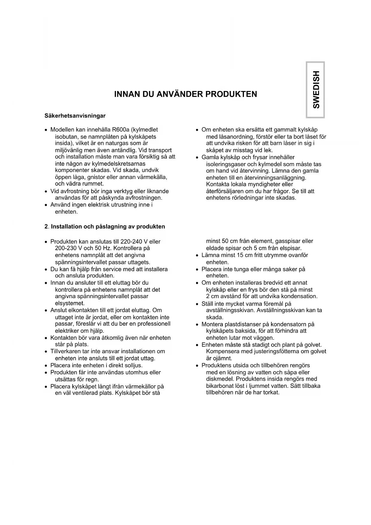 - Modellen kan innehålla R600a (kylmedlet isobutan, se namnplåten på kylskåpets insida), vilket är en naturgas som är miljövänlig men även antändlig. Vid transport och installation måste man vara försiktig så att inte någon av kylmedelskretsarnas komponenter skadas. Vid skada, undvik öppen låga, gnistor eller annan värmekälla, och vädra rummet.