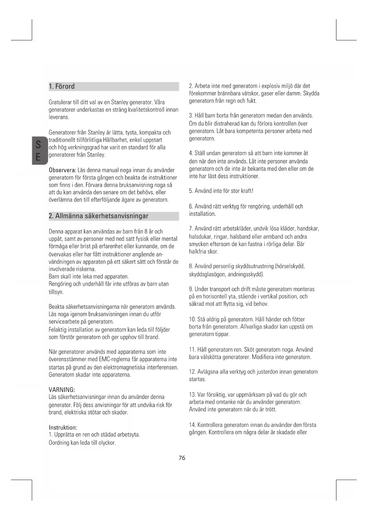 Gratulerar till ditt val av en Stanley generator. Våra generatorer underkastas en sträng kvalitetskontroll innan leverans. Generatorer från Stanley är lätta, tysta, kompakta och traditionellt tillförlitliga Hållbarhet, enkel uppstart och hög verkningsgrad har varit en standard för alla generatorer från Stanley. Observera: Läs denna manual noga innan du använder generatorn för första gången och beakta de instruktioner som finns i den. Förvara denna bruksanvisning noga så att du kan använda den senare om det behövs, eller överlämna den till efterföljande ägare av generatorn.