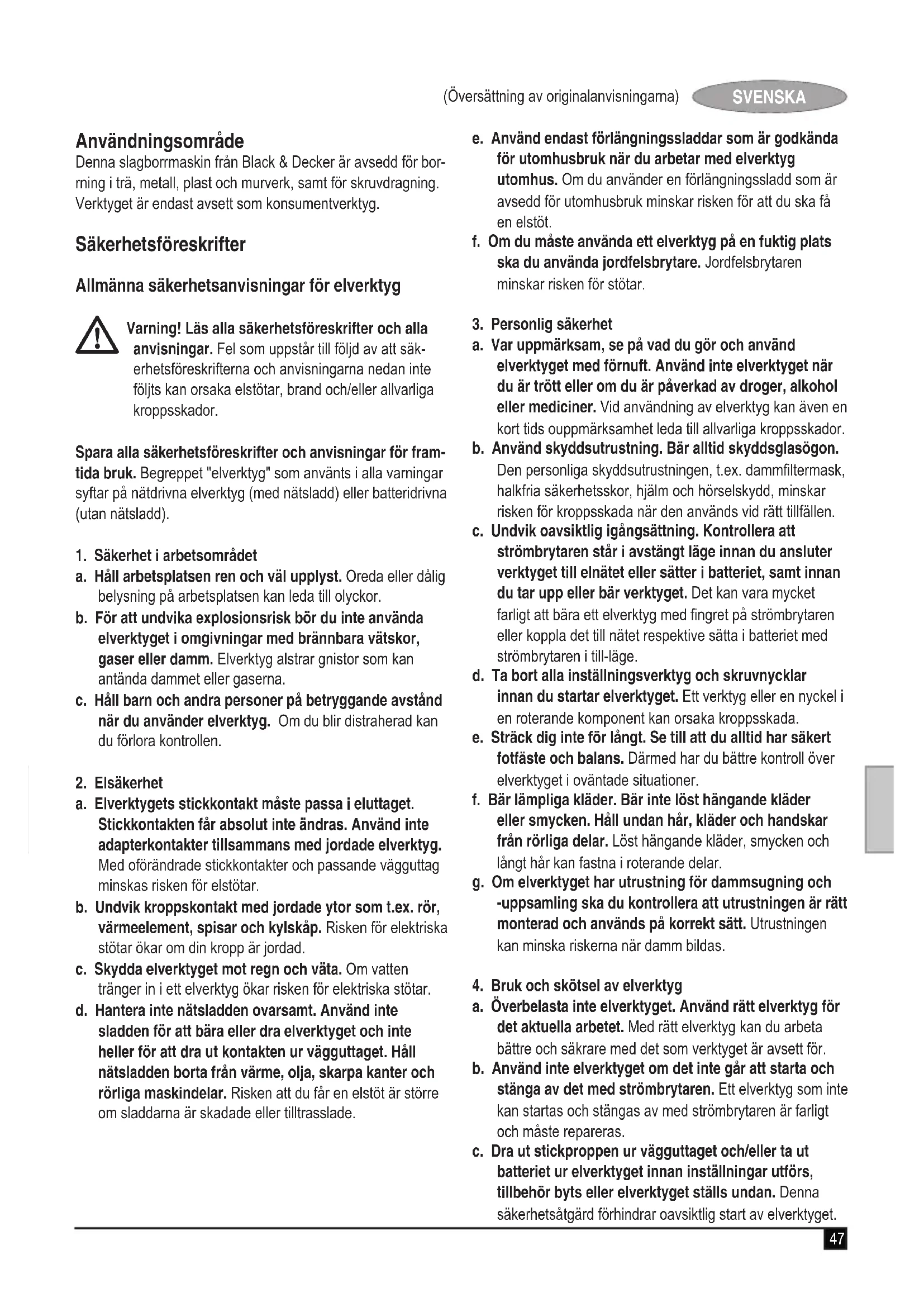 Kevin Hewitt Vice-President Global Engineering Black & Decker Europe, 210 Bath Road, Slough, Berkshire, SL1 3YD Storbritannien 18/02/201152 (Översättning av originalanvisningarna) SVENSKA Garanti Black & Decker garanterar att produkten är fri från material- och/eller fabrikationsfel vid leverans till kund. Garantin gäller utöver konsumentens rättigheter enligt lag och påverkar inte dessa. Garantin gäller inom medlemsstaterna i Europeiska Unionen och i det Europeiska Frihandelsområdet. Om en Black & Decker-produkt går sönder på grund av material- och/eller fabrikationsfel eller brister i överensstäm- melse med specikationen, inom 24 månader från köpet, åtar sig Black & Decker att reparera eller byta ut produkten med minsta besvär för kunden, förutom om: u Produkten har använts i kommersiellt eller yrkesmässigt syfte eller i uthyrningssyfte. u Produkten har utsatts för felaktig användning eller skötsel. u Produkten har skadats av främmande föremål, ämnen eller genom olyckshändelse. u Reparation har utförts av någon annan än en auktoriserad Black & Decker-verkstad. Vid garantianspråk ska produkten och inköpskvittot lämnas till återförsäljaren eller till en auktoriserad verkstad. För information om närmaste auktoriserade verkstad, kontakta det lokala Black & Decker-kontoret på den adress som är angiven i bruksanvisningen. En lista över alla auktoriserade Black & Decker-verkstäder samt servicevillkor nns på Internet: www.2helpU.com Besök vår webbplats www.blackanddecker.se för att registrera din nya Black & Decker-produkt samt för att erhålla informa- tion om nya produkter och specialerbjudanden. Vidare infor- mation om märket Black & Decker och vårt produktsortiment åternns på www.blackanddecker.se53 (Oversettelse av de opprinnelige instruksjonene) NORSK Bruksområde Din slagdrill fra Black & Decker er utformet for boring i tre, metall, plast og mur og for bruk som skrutrekker. Verktøyet er beregnet bare som konsumentverktøy. Sikkerhetsinstruksjoner Generelle sikkerhetsadvarsler for elektroverktøy