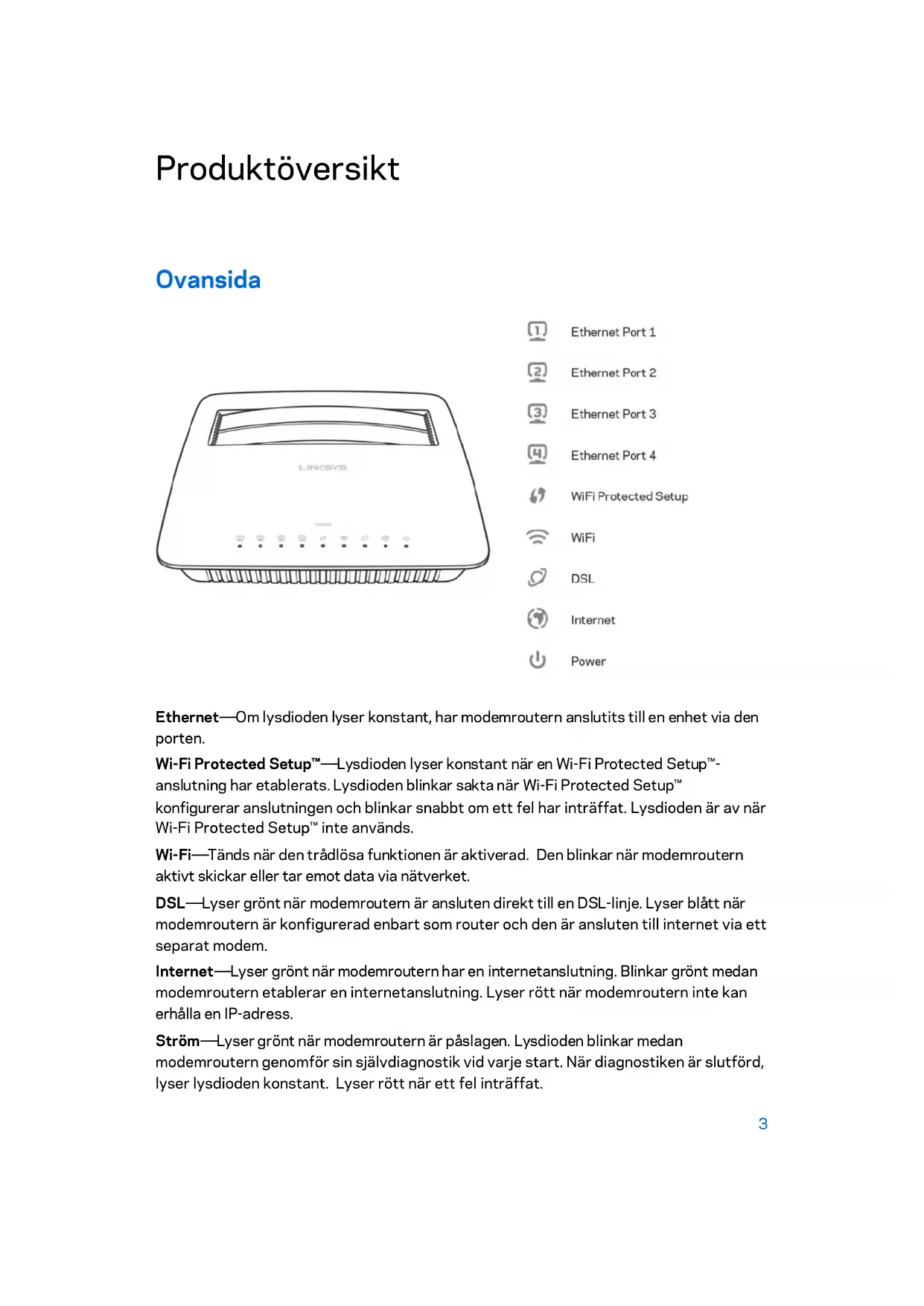Ethernet------Om lysdioden lyser konstant, har modemroutern anslutits till en enhet via den porten. Wi-Fi Protected Setup™------Lysdioden lyser konstant när en Wi-Fi Protected Setup™- anslutning har etablerats. Lysdioden blinkar sakta när Wi-Fi Protected Setup™ konfigurerar anslutningen och blinkar snabbt om ett fel har inträffat. Lysdioden är av när Wi-Fi Protected Setup™ inte används. Wi-Fi------Tänds när den trådlösa funktionen är aktiverad. Den blinkar när modemroutern aktivt skickar eller tar emot data via nätverket. DSL------Lyser grönt när modemroutern är ansluten direkt till en DSL-linje. Lyser blått när modemroutern är konfigurerad enbart som router och den är ansluten till internet via ett separat modem. Internet------Lyser grönt när modemroutern har en internetanslutning. Blinkar grönt medan modemroutern etablerar en internetanslutning. Lyser rött när modemroutern inte kan erhålla en IP-adress. Ström------Lyser grönt när modemroutern är påslagen. Lysdioden blinkar medan modemroutern genomför sin självdiagnostik vid varje start. När diagnostiken är slutförd, lyser lysdioden konstant. Lyser rött när ett fel inträffat. 3Baksida