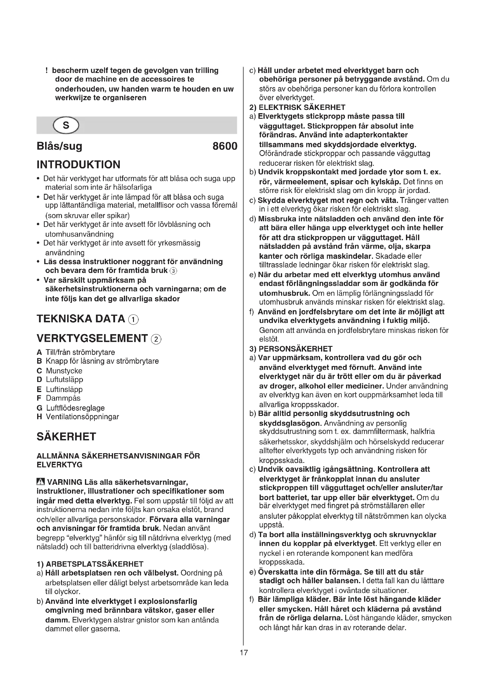 - Det här verktyget har utformats för att blåsa och suga upp material som inte är hälsofarliga