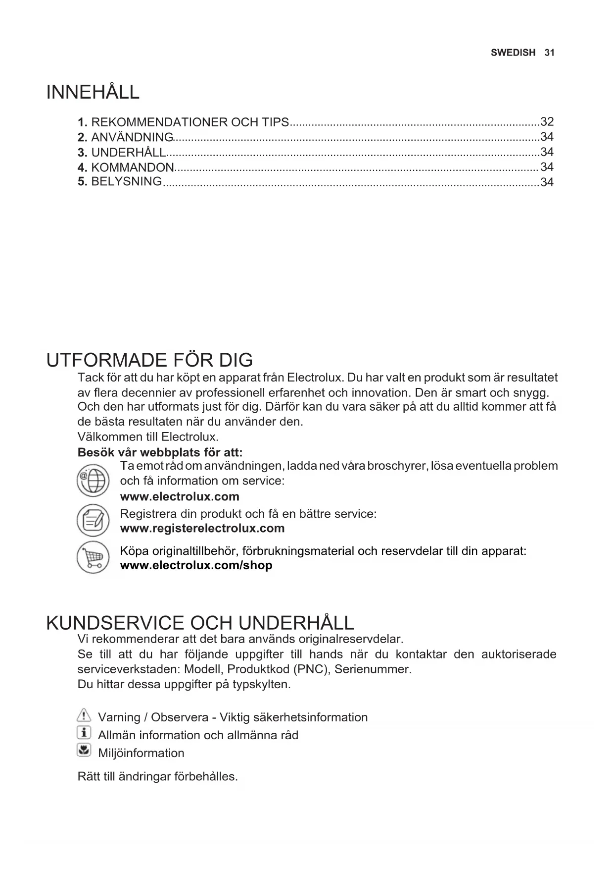 Vi rekommenderar att det bara används originalreservdelar. Se till att du har följande uppgifter till hands när du kontaktar den auktoriserade serviceverkstaden: Modell, Produktkod (PNC), Serienummer. Du hittar dessa uppgifter på typskylten. Varning / Observera - Viktig säkerhetsinformation Allmän information och allmänna råd Miljöinformation Rätt till ändringar förbehålles.32 www.electrolux.com