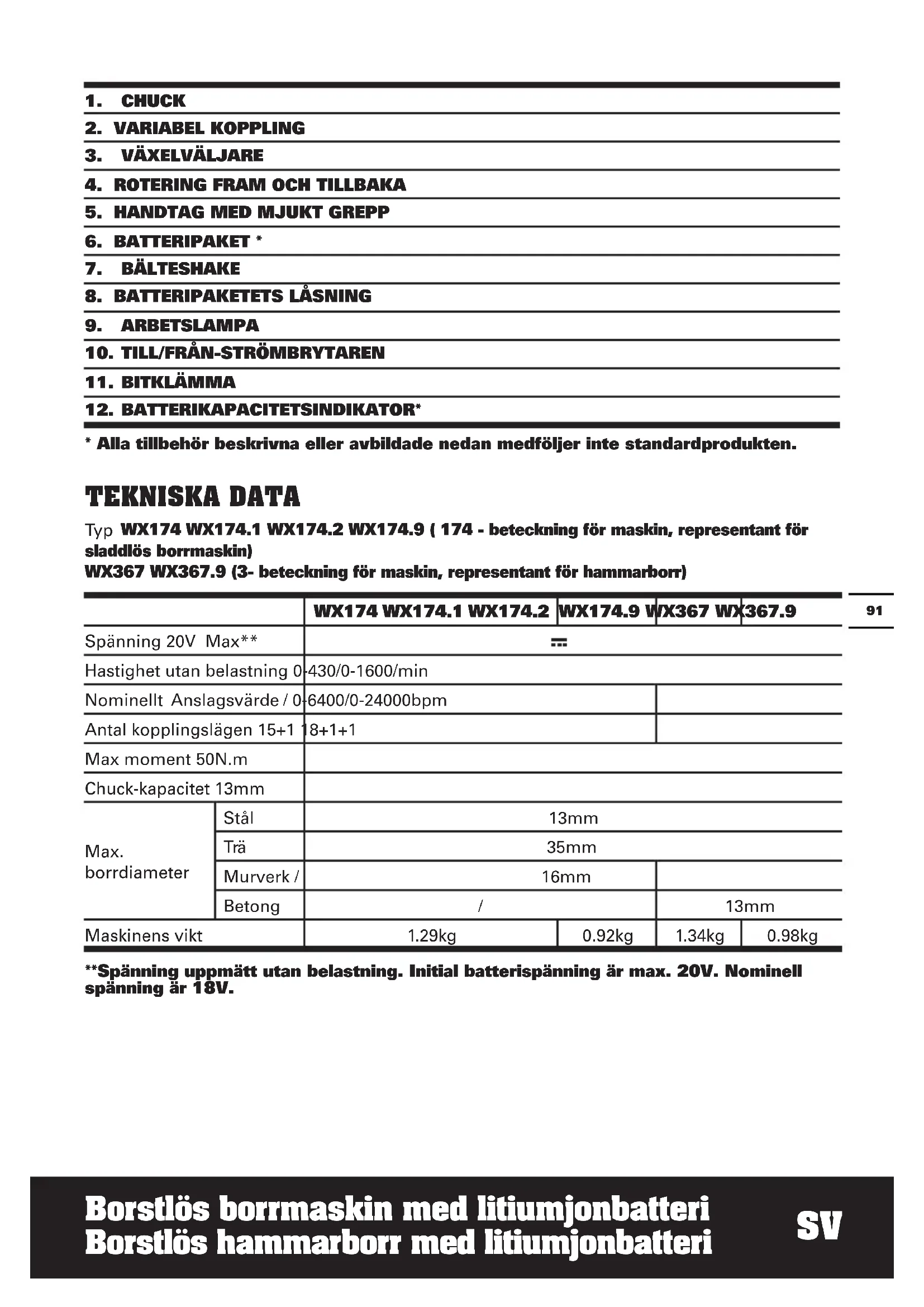 TEKNISKA DATA Typ WX174 WX174.1 WX174.2 WX174.9 ( 174 - beteckning för maskin, representant för sladdlös borrmaskin) WX367 WX367.9 (3- beteckning för maskin, representant för hammarborr) WX174 WX174.1 WX174.2 WX174.9 WX367 WX367.9 Spänning 20V Max** Hastighet utan belastning 0-430/0-1600/min Nominellt Anslagsvärde / 0-6400/0-24000bpm Antal kopplingslägen 15+1 18+1+1 Max moment 50N.m Chuck-kapacitet 13mm Max. borrdiameter Stål 13mm Trä 35mm Murverk / 16mm Betong / 13mm Maskinens vikt 1.29kg 0.92kg 1.34kg 0.98kg **Spänning uppmätt utan belastning. Initial batterispänning är max. 20V. Nominell spänning är 18V.