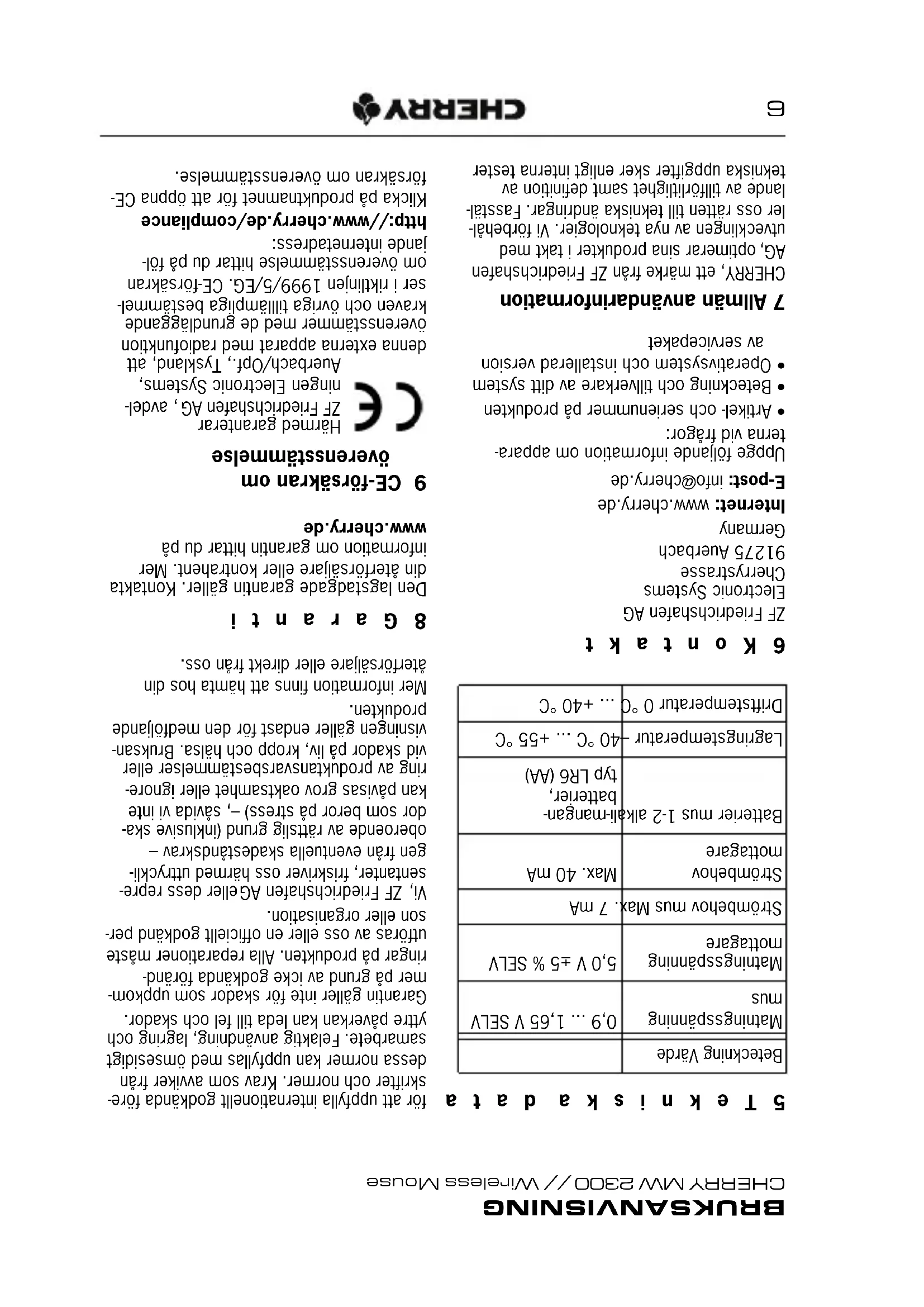 - Operativsystem och installerad version av servicepaket 7 Allmän användarinformation CHERRY, ett märke från ZF Friedrichshafen AG, optimerar sina produkter i takt med utvecklingen av nya teknologier. Vi förbehål- ler oss rätten till tekniska ändringar. Fasstäl- lande av tillförlitlighet samt definition av tekniska uppgifter sker enligt interna tester Beteckning Värde Matningsspänning mus 0,9 ... 1,65 V SELV Matningsspänning mottagare 5,0 V ±5 % SELV Strömbehov mus Max. 7 mA Strömbehov mottagare Max. 40 mA Batterier mus 1-2 alkali-mangan- batterier, typ LR6 (AA) Lagringstemperatur –40 °C ... +55 °C Driftstemperatur 0 °C ... +40 °C för att uppfylla internationellt godkända före- skrifter och normer. Krav som avviker från dessa normer kan uppfyllas med ömsesidigt samarbete. Felaktig användning, lagring och yttre påverkan kan leda till fel och skador. Garantin gäller inte för skador som uppkom- mer på grund av icke godkända föränd- ringar på produkten. Alla reparationer måste utföras av oss eller en officiellt godkänd per- son eller organisation. Vi, ZF Friedrichshafen AG eller dess repre- sentanter, friskriver oss härmed uttryckli- gen från eventuella skadeståndskrav – oberoende av rättslig grund (inklusive ska- dor som beror på stress) –, såvida vi inte kan påvisas grov oaktsamhet eller ignore- ring av produktansvarsbestämmelser eller vid skador på liv, kropp och hälsa. Bruksan- visningen gäller endast för den medföljande produkten. Mer information finns att hämta hos din återförsäljare eller direkt från oss. 8Garanti Den lagstadgade garantin gäller. Kontakta din återförsäljare eller kontrahent. Mer information om garantin hittar du på www.cherry.de 9 CE-försäkran om överensstämmelse Härmed garanterar ZF Friedrichshafen AG , avdel- ningen Electronic Systems, Auerbach/Opf., Tyskland, att denna externa apparat med radiofunktion överensstämmer med de grundläggande kraven och övriga tilllämpliga bestämmel- ser i riktlinjen 1999/5/EG. CE-försäkran om överensstämmelse hittar du på föl- jande internetadress: http://www.cherry.de/compliance Klicka på produktnamnet för att öppna CE- försäkran om överensstämmelse. BRUKSANVISNING CHERRY MW 2300 // Wireless Mouse5