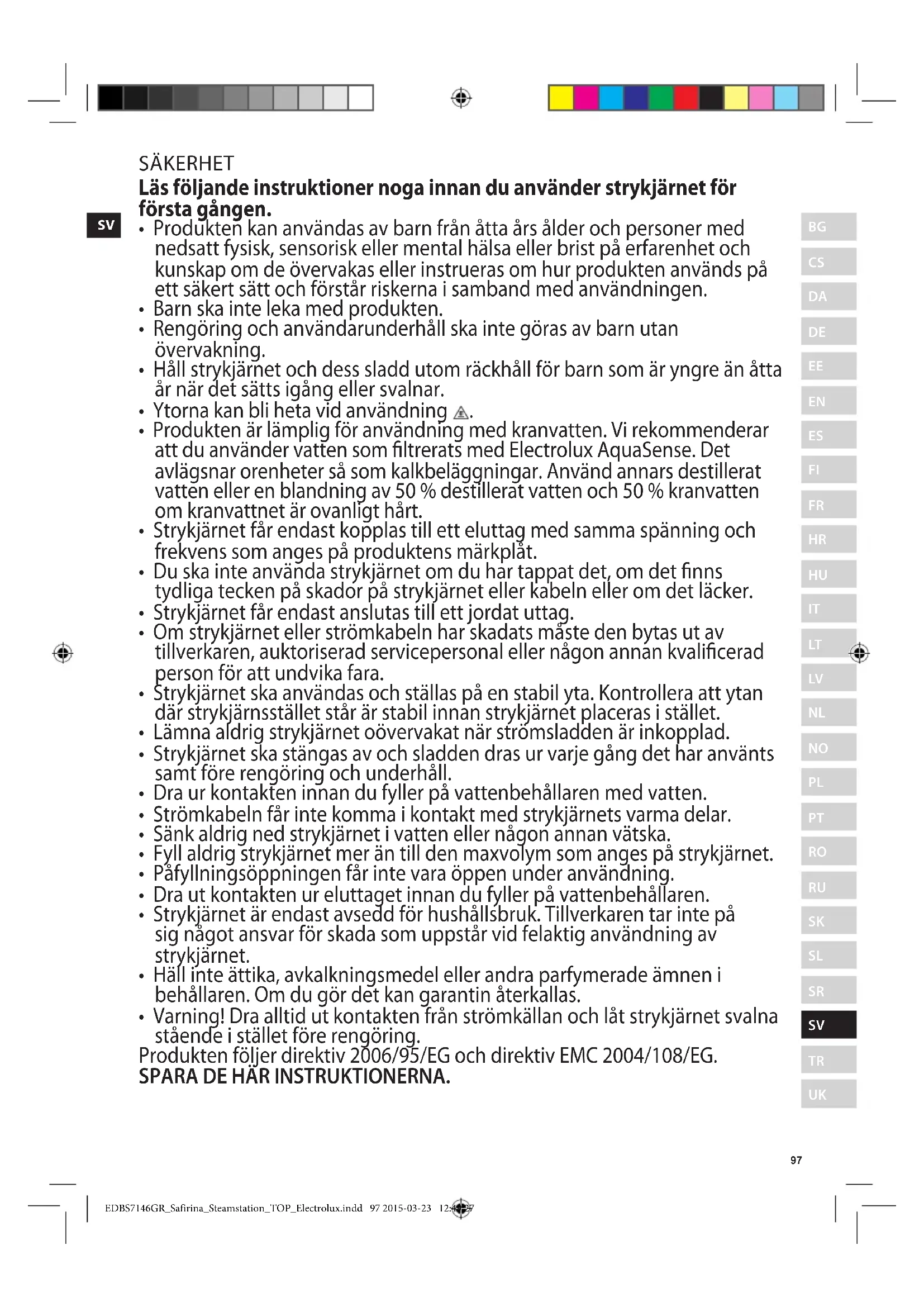 EDBS7146GR_Safirina_Steamstation_TOP_Electrolux.indd 96 2015-03-23 12:49:27SV SÄKERHET Läs följande instruktioner noga innan du använder strykjärnet för första gången.