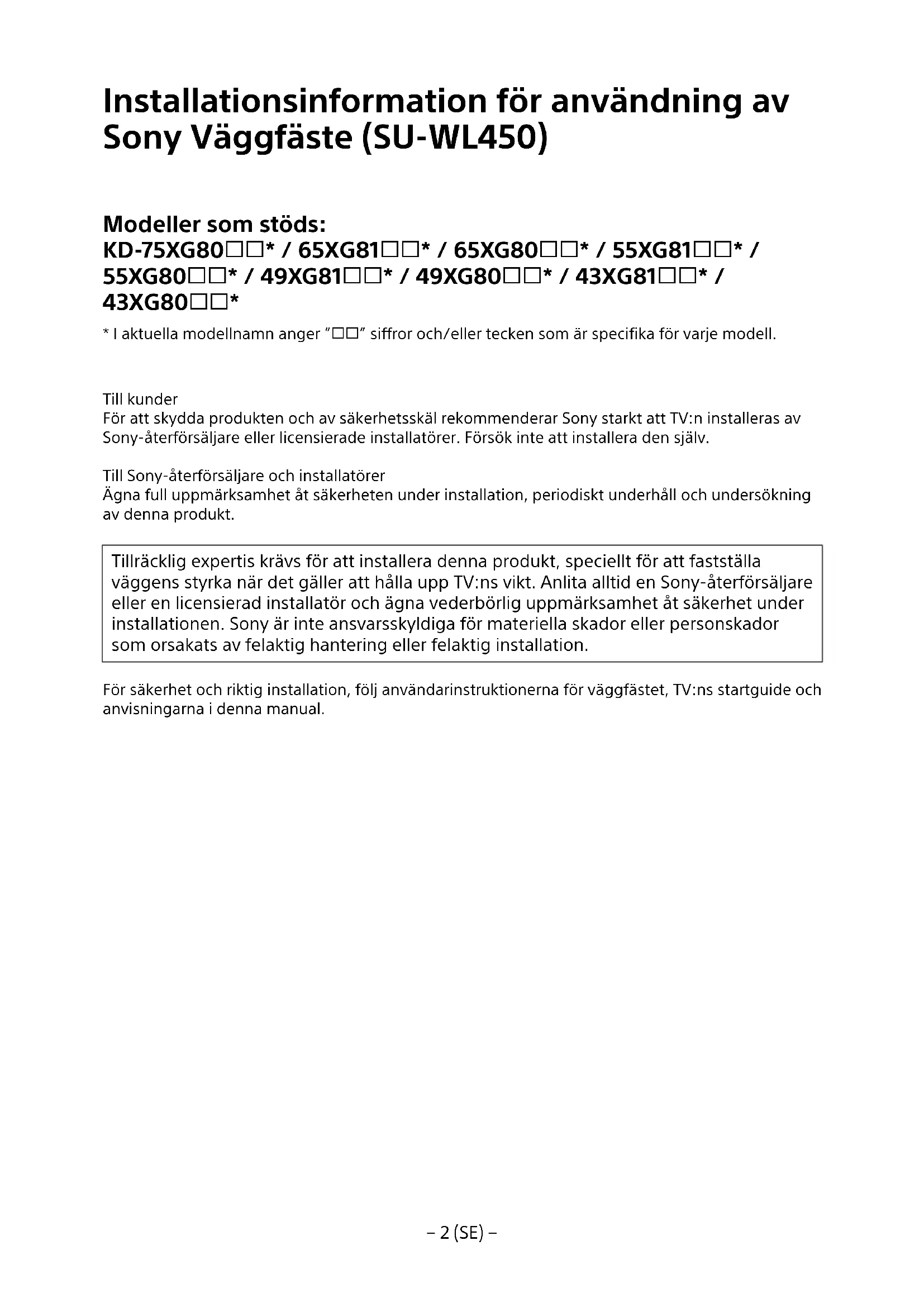 Installationen avennaprodukt kraver att du har tillrackliga kunskaper.For att du skunna gora den har installationen saker maste du ta del av informationen i den har bruksanvisingen.Sony kan inte hallas ansvarigt for eventuella skador erler personskador som orsakats av felaktig anvandning ell feraktig installation.Vanligen ge den har bruksanvisingen till kunden after utford installation.