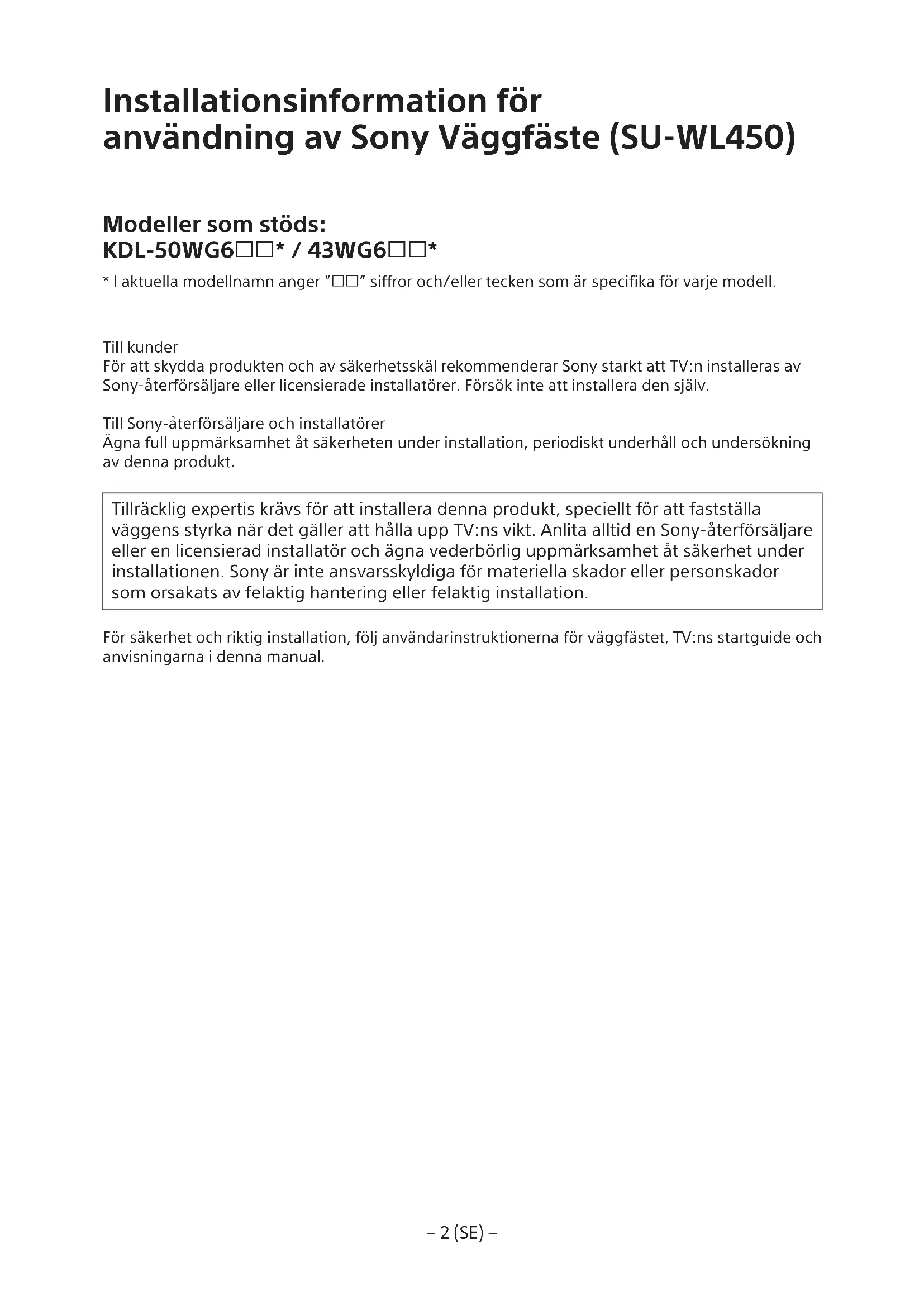 - I aktuella modellnamn anger ”” siffror och/eller tecken som är specifika för varje modell. Till kunder För att skydda produkten och av säkerhetsskäl rekommenderar Sony starkt att TV:n installeras av Sony-återförsäljare eller licensierade installatörer. Försök inte att installera den själv. Till Sony-återförsäljare och installatörer Ägna full uppmärksamhet åt säkerheten under installation, periodiskt underhåll och undersökning av denna produkt. Tillräcklig expertis krävs för att installera denna produkt, speciellt för att fastställa väggens styrka när det gäller att hålla upp TV:ns vikt. Anlita alltid en Sony-återförsäljare eller en licensierad installatör och ägna vederbörlig uppmärksamhet åt säkerhet under installationen. Sony är inte ansvarsskyldiga för materiella skador eller personskador som orsakats av felaktig hantering eller felaktig installation. För säkerhet och riktig installation, följ användarinstruktionerna för väggfästet, TV:ns startguide och anvisningarna i denna manual.− 3 (SE) − Om säkerhet Tack för att du valt denna produkt. Till kunder Installationen av denna produkt kräver att du har tillräckliga kunskaper. Se till att anlita en Sony-återförsäljare eller en behörig montör för att utföra installationen och var särskilt noggrann med säkerheten under installationen. Sony är inte ansvarigt för eventuella person- eller materiella skador som orsakats av felaktig hantering eller felaktig installation, eller av att annat än den specificerade produkten installerats. Dina eventuella lagenliga rättigheter påverkas inte. För Sony-återförsäljare Installationen av denna produkt kräver att du har tillräckliga kunskaper. För att du ska kunna göra den här installationen säker måste du ta del av informationen i den här bruksanvisningen. Sony kan inte hållas ansvarigt för eventuella skador eller personskador som orsakats av felaktig användning eller felaktig installation. Vänligen ge den här bruksanvisningen till kunden efter utförd installation. I den här bruksanvisningen finns instruktioner för hur produkten används samt information om sådant som du bör känna till för att undvika olyckor. Läs den här guiden noga och använd produkten enligt instruktionerna. Behåll den här bruksanvisningen för framtida bruk. Produkter från Sony är utformade med tanke på säkerhet. Om produkterna emellertid används felaktigt kan det leda till allvarliga personskador till följd av brand, elstötar eller av att produkten vält eller fallit ned. Förebygg sådana olyckor genom att inte åsidosätta säkerheten. SE UPP Angivna produkter Detta väggfäste är tillverkat för att användas tillsammans med passande TV-apparater. Se respektive referensguide för varje TV-apparat för att se om detta väggfäste kan användas. Till kunder VARNING Om följande säkerhetsföreskrifter inte följs kan det leda till allvarliga personskador eller dödsfall som följd av brand, elektriska stötar, att produkten välter eller faller ner. Överlåt installationen till behörig personal och se till att små barn inte befinner sig i närheten när installationen utförs. Om väggfästet eller TV:n inte installeras på rätt sätt kan följande olyckor ske. Se till att installationen utförs av behörig personal.