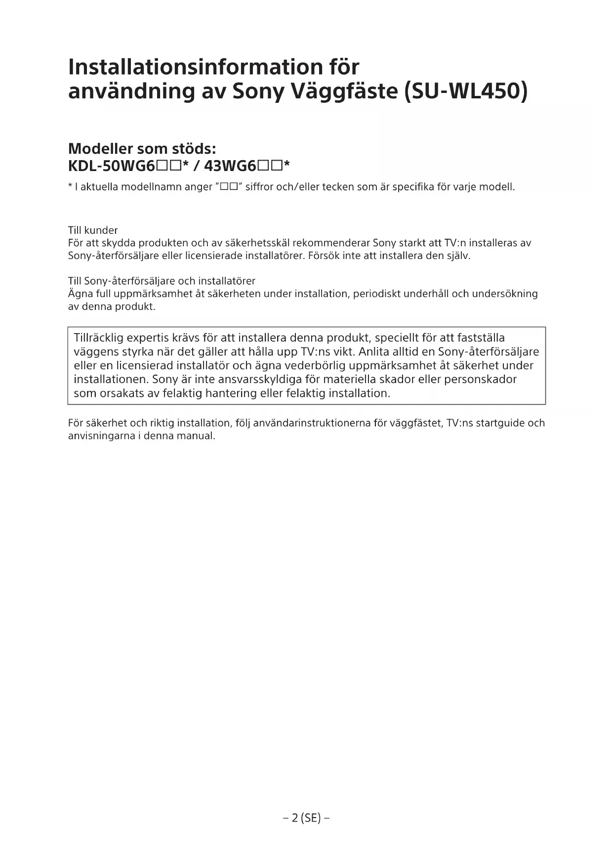 Installationen avennaprodukt kraver att du har tillrackliga kunskaper.For att du skunna gora den har installationen saker maste du ta del av informationen i den har bruksanvisingen.Sony kan inte hallas ansvarigt for eventuella skador erler personskador som orsakats av felaktig anvandning ell feraktig installation.Vanligen ge den har bruksanvisingen till kunden after utford installation.