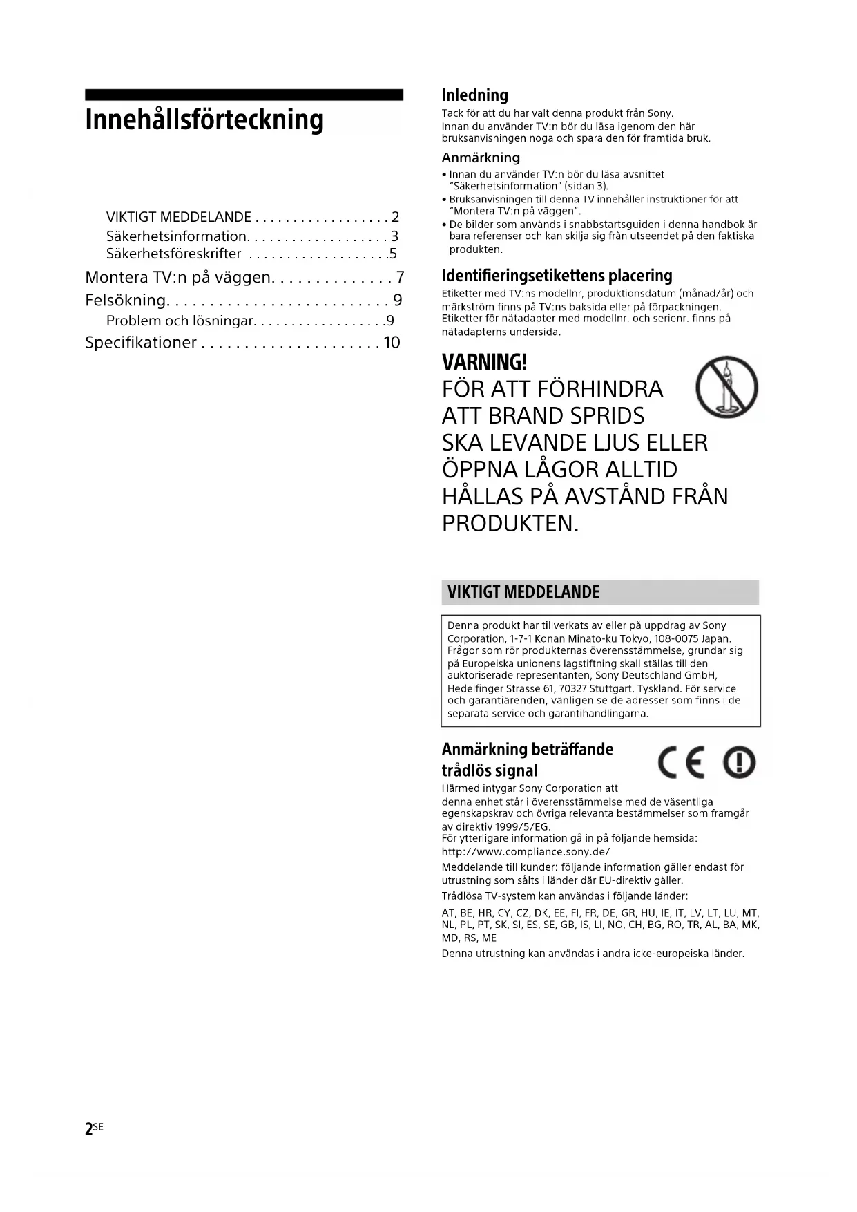 HÅLLAS PÅ AVSTÅND FRÅN PRODUKTEN. Anmärkning beträffande trådlös signal Härmed intygar Sony Corporation att denna enhet står i överensstämmelse med de väsentliga egenskapskrav och övriga relevanta bestämmelser som framgår av direktiv 1999/5/EG.För ytterligare information gå in på följande hemsida:http://www.compliance.sony.de/Meddelande till kunder: följande information gäller endast för utrustning som sålts i länder där EU-direktiv gäller.Trådlösa TV-system kan användas i följande länder: AT, BE, HR, CY, CZ, DK, EE, FI, FR, DE, GR, HU, IE, IT, LV, LT, LU, MT, NL, PL, PT, SK, SI, ES, SE, GB, IS, LI, NO, CH, BG, RO, TR, AL, BA, MK, MD, RS, MEDenna utrustning kan användas i andra icke-europeiska länder. VIKTIGT MEDDELANDE Denna produkt har tillverkats av eller på uppdrag av Sony Corporation, 1-7-1 Konan Minato-ku Tokyo, 108-0075 Japan. Frågor som rör produkternas överensstämmelse, grundar sig på Europeiska unionens lagstiftning skall ställas till den auktoriserade representanten, Sony Deutschland GmbH, Hedelfinger Strasse 61, 70327 Stuttgart, Tyskland. För service och garantiärenden, vänligen se de adresser som finns i de separata service och garantihandlingarna.3
