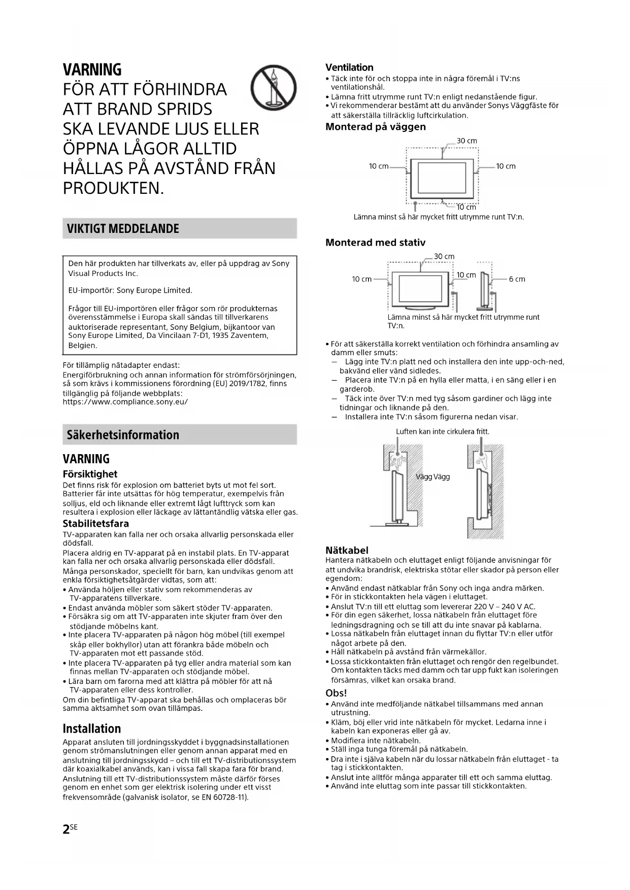 HÅLLAS PÅ AVSTÅND FRÅN PRODUKTEN. VIKTIGT MEDDELANDE För tillämplig nätadapter endast: Energiförbrukning och annan information för strömförsörjningen, så som krävs i kommissionens förordning (EU) 2019/1782, finns tillgänglig på följande webbplats: https://www.compliance.sony.eu/ Säkerhetsinformation VARNING Försiktighet Det finns risk för explosion om batteriet byts ut mot fel sort. Batterier får inte utsättas för hög temperatur, exempelvis från solljus, eld och liknande eller extremt lågt lufttryck som kan resultera i explosion eller läckage av lättantändlig vätska eller gas. Stabilitetsfara TV-apparaten kan falla ner och orsaka allvarlig personskada eller dödsfall. Placera aldrig en TV-apparat på en instabil plats. En TV-apparat kan falla ner och orsaka allvarlig personskada eller dödsfall. Många personskador, speciellt för barn, kan undvikas genom att enkla försiktighetsåtgärder vidtas, som att: