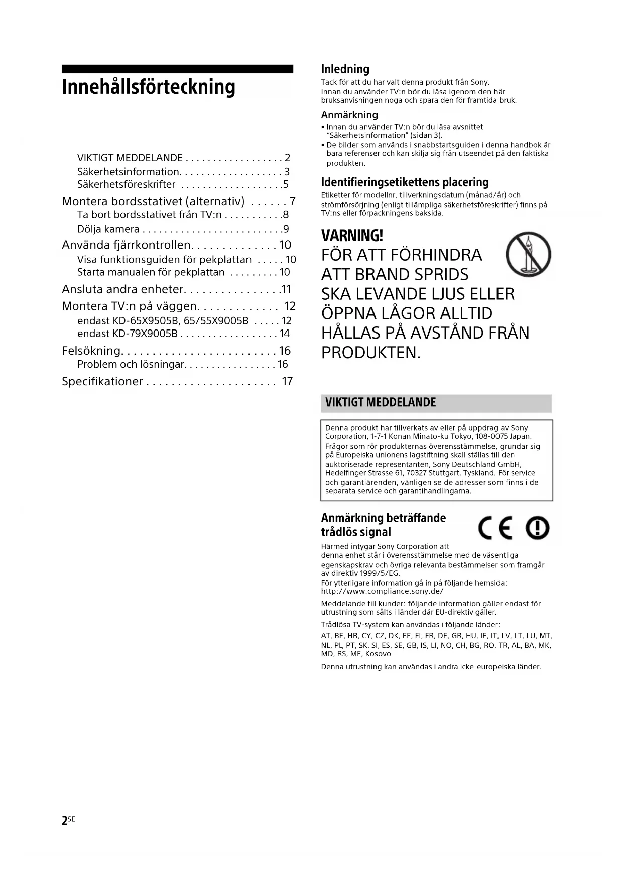 - Specifikationer Inledning Tack för att du har valt denna produkt från Sony. Innan du använder TV:n bör du läsa igenom den här bruksanvisningen noga och spara den för framtida bruk.Anmärkning• Innan du använder TV:n bör du läsa avsnittet “Säkerhetsinformation” (sidan 3). p. 17