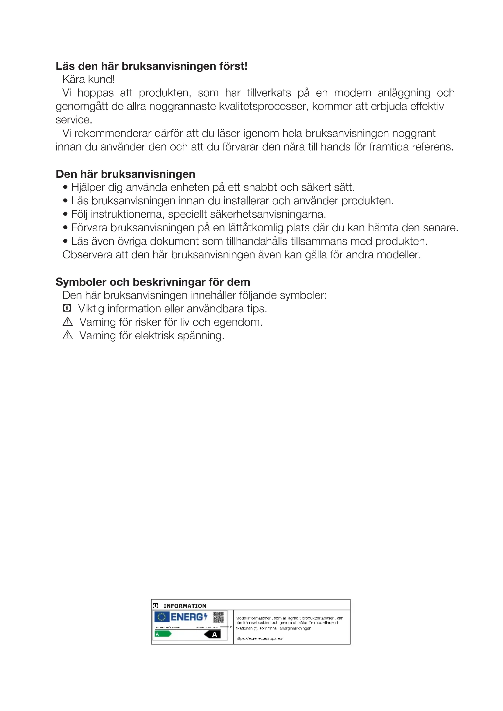 - Läs även övriga dokument som tillhandahålls tillsammans med produkten. Observera att den här bruksanvisningen även kan gälla för andra modeller. Symboler och beskrivningar för dem Den här bruksanvisningen innehåller följande symboler: C Viktig information eller användbara tips. A Varning för risker för liv och egendom. B Varning för elektrisk spänning. INFORMATION Modellinformationen, som är lagrad t produktdatabasen, kan nås från webbsidan och genom att söka för modellindenti-fikationen (*), som finns i energimärkningen.https://eprel.ec.europa.eu/