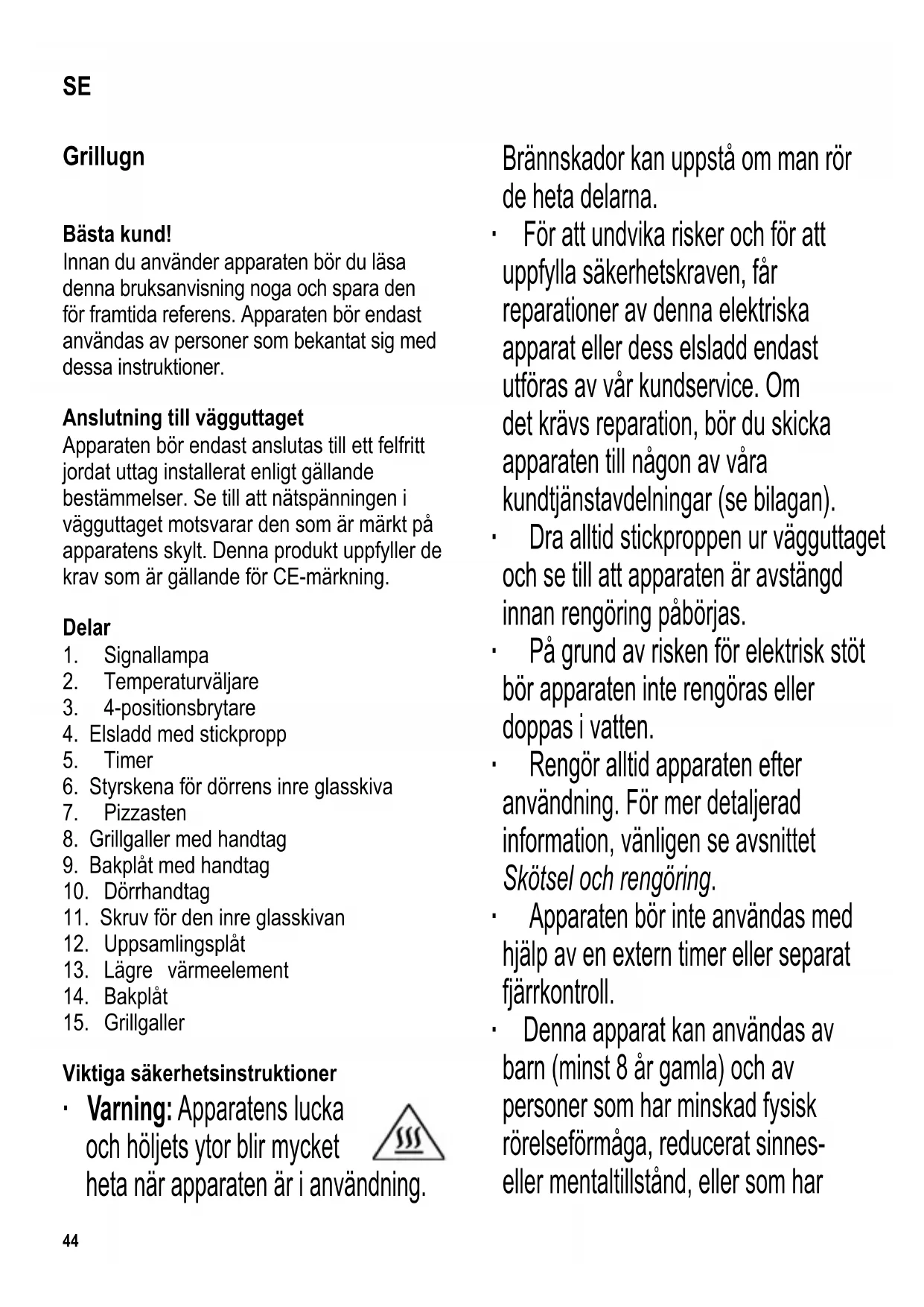 Viktiga säkerhetsinstruktioner ∙ Varning: Apparatens lucka och höljets ytor blir mycket heta när apparaten är i användning. Brännskador kan uppstå om man rör de heta delarna. ∙ För att undvika risker och för att uppfylla säkerhetskraven, får reparationer av denna elektriska apparat eller dess elsladd endast utföras av vår kundservice. Om det krävs reparation, bör du skicka apparaten till någon av våra kundtjänstavdelningar (se bilagan). ∙ Dra alltid stickproppen ur vägguttaget och se till att apparaten är avstängd innan rengöring påbörjas. ∙ På grund av risken för elektrisk stöt bör apparaten inte rengöras eller doppas i vatten. ∙ Rengör alltid apparaten efter användning. För mer detaljerad information, vänligen se avsnittet Skötsel och rengöring. ∙ Apparaten bör inte användas med hjälp av en extern timer eller separat fjärrkontroll. ∙ Denna apparat kan användas av barn (minst 8 år gamla) och av personer som har minskad fysisk rörelseförmåga, reducerat sinnes- eller mentaltillstånd, eller som har SE45 bristfällig erfarenhet och kunskap, förutsatt att dessa personer är under uppsyn eller har fått tillräckliga instruktioner beträffande apparatens användning och vet vilka risker och säkerhetsåtgärder som användningen innefattar. ∙ Barn bör inte tillåtas leka med apparaten. ∙ Barn bör inte tillåtas rengöra eller göra service på apparaten ifall de inte är övervakade och minst 8 år gamla. ∙ Apparaten och dess elsladd bör hållas utom räckhåll för barn under 8 år. ∙ Varning: Håll barn på avstånd från apparatens förpackningsmaterial eftersom fara eventuellt kan uppstå. Det fi nns t.ex. risk för kvävning. ∙ Innan varje användning bör apparaten samt dess elsladd och monterade tillbehör inspekteras noga så att de inte har några skador. Om apparaten t ex har tappats på en hård yta, eller om elsladden har utsatts för alltför hård kraft, bör den inte längre användas: Även osynliga skador kan försämra apparatens driftsäkerhet. ∙ Vidrör inte värmeelementen. ∙ Innan apparaten används bör uppsamlingsplåten placeras i korrekt läge under de nedre värmeelementen. ∙ Olja eller fett som överhettas kan fatta eld. Se därför till att bakplåten inte blir överfylld; detta förhindrar fett från att rinna på värmeelementen. ∙ Apparaten bör alltid vara under uppsikt när den är i användning. ∙ Använd inte apparaten utomhus. ∙ Se alltid till att ventilationen är tillräcklig. Placera inga föremål ovanpå ugnen och se till att det fria avståndet mellan ugnen och väggen eller andra föremål är minst följande: Sidorna: 12 cm Ovanför: 30 cm ∙ Enheten får inte installeras inuti ett skåp; placera den inte heller direkt under ett skåp eller dylika föremål. ∙ Fötterna på ugnens undersida bör inte tas bort. ∙ Placera inte apparaten eller använd apparaten nära eller under väggskåp eller hängande föremål såsom gardiner eller annat lättantändligt material. ∙ När apparaten är påkopplad bör den ställas på en värmebeständig yta, som är okänslig för stänk eller fl äckar. Placera inte apparaten på eller i närheten av heta ytor, öppen eld eller lättantändliga ångor. ∙ Varning: Pizzastenen blir mycket het vid användningen och svalnar mycket långsamt efter det att apparaten har stängts av och kopplats från eluttaget. Risken för brännskador är stor om någon kommer i direktkontakt med stenen. ∙ Låt alltid pizzastenen svalna helt innan du avlägsnar den från apparaten. ∙ Varning: Lägg inte aluminiumfolie eller liknande mellan grillgallret och pizzastenen. Placera stenen direkt på gallret. ∙ Se till att elsladden inte kommer i kontakt med apparatens heta ytor.46 ∙ Låt inte sladden hänga fritt. ∙ Stäng alltid av apparaten och dra stickproppen ur vägguttaget - efter användning, - om apparaten skulle uppvisa fel och, och - innan apparaten rengörs. ∙ Tag stickproppen ur vägguttaget genom att dra i stickproppen, aldrig i sladden. ∙ Om apparaten använts felaktigt eller om bruksanvisningen inte följts, kan inga krav ställas mot leverantören eller försäljaren. ∙ Apparaten är avsedd för hemmabruk eller liknande användning, såsom - i kontor och andra kommersiella miljöer, - i företag inom jordbrukssektorn, - för kunder i hotell, motell och andra liknande anläggningar, - för kunder i bed-and-breakfast hus. Temperaturväljare Temperaturväljaren används för att välja den önskade temperaturnivån. 4-positionsbrytarens inställningar Övervärme med varmluftskonvektion Övervärme Undervärme Över- och undervärme med varmluftskonvektion Grillelementen upphettas endast då timern är aktiverad. Timer Timern kan du använda för att välja antingen en specifi k tillagningstid (upp till 60 minuter) eller kontinuerlig drift. För kontinuerlig drift vrider du timern motsols till positionen . För att stänga av apparaten vrider du timern tillbaka till läget ‘