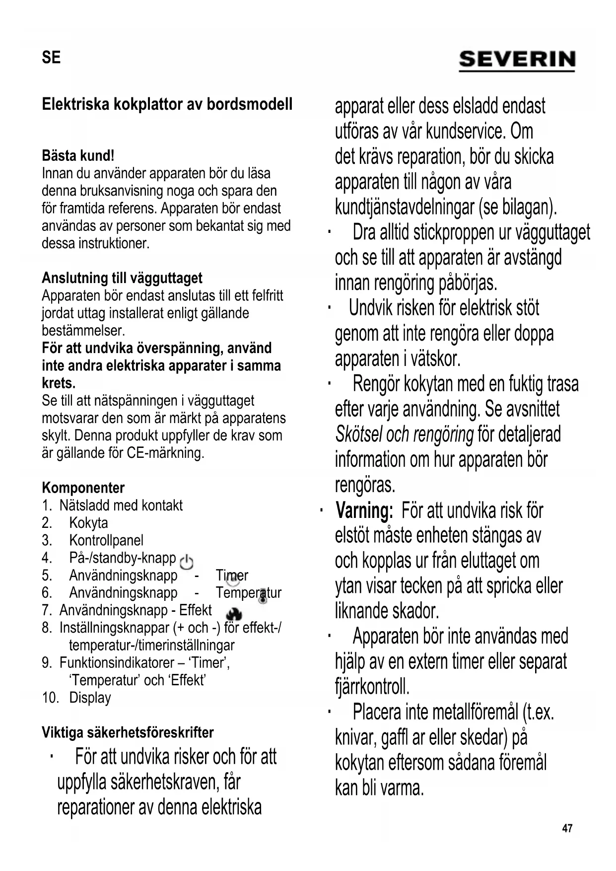 SE Bruksanvisning Elektriska kokplattor av bordsmodell 47