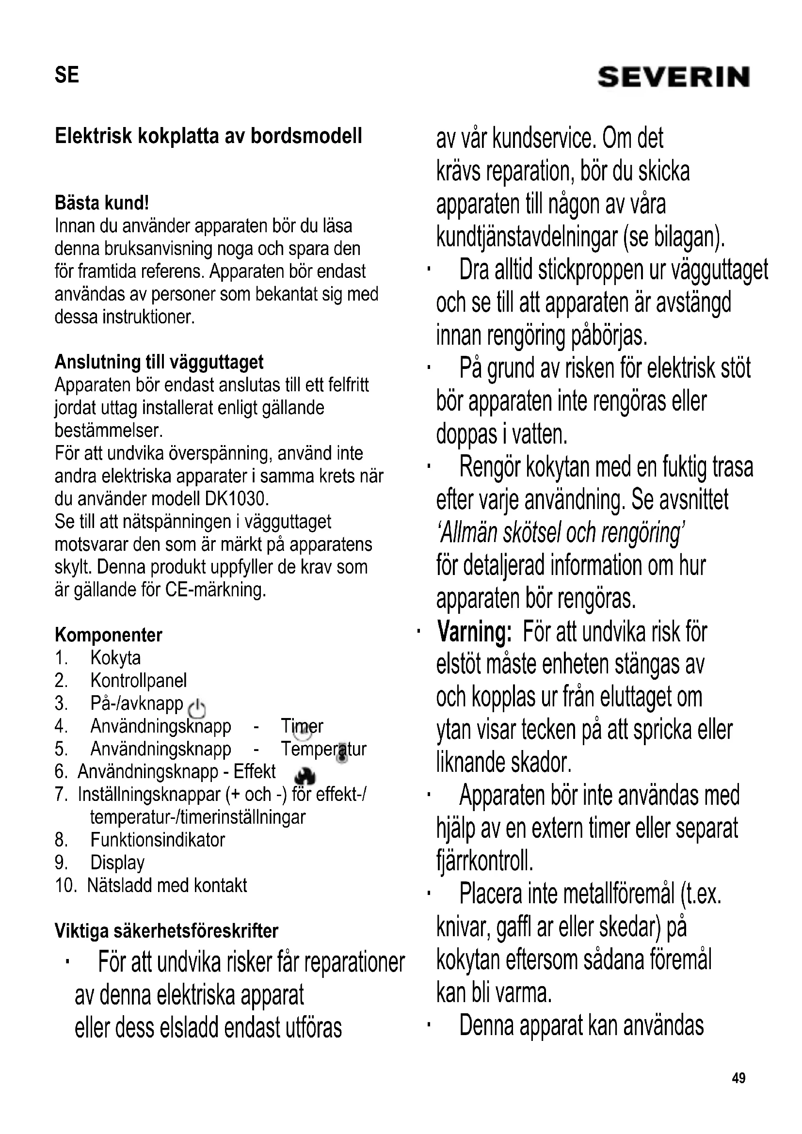 SE Bruksanvisning Elektrisk kokplatta av bordsmodell 49
