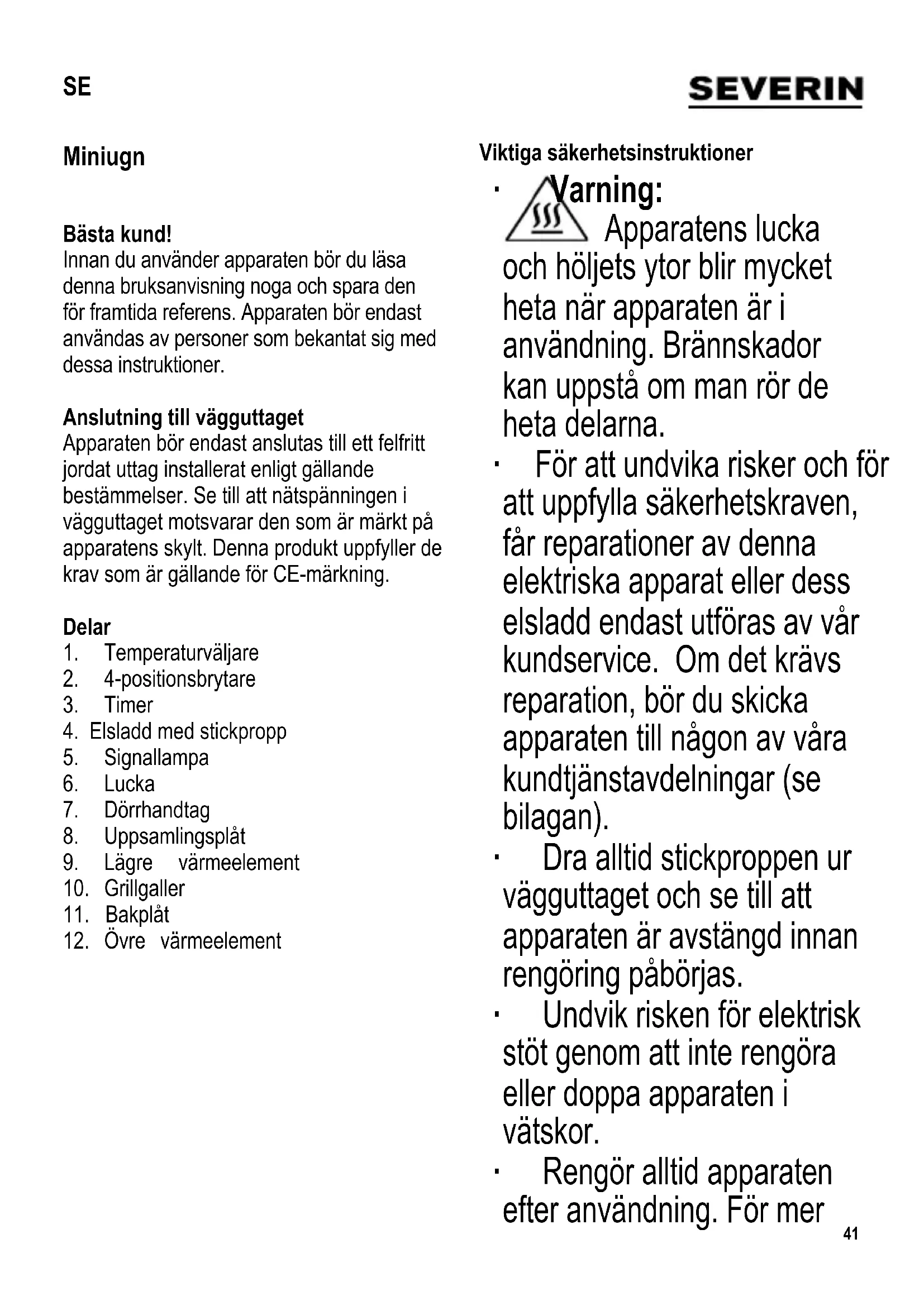 ∙ Använd alltid luckans handtag för att öppna den heta luckan efter användningen. Använd en lämplig ugnshanske då du lyfter ut bakplåten eller gallret. Placera alltid bakplåten eller gallret på en värmetålig yta. ∙ Dra stickproppen ur vägguttaget efter användningen. Tillagningstider Tillagningstiderna är endast ungefärliga, eftersom all mat som tillagas är olika till beskaffenhet och konsistens; vänligen läs även informationen på matförpackningen. Mat Temperatur/ inställning Tillagningstid Pizza (fryst) 200 °C 11-13 min. Hawaii toast 220 °C 10-14 min. Baguette (fryst) 200 °C 16-17 min.45 Skötsel och rengöring ∙ Dra alltid stickproppen ur vägguttaget och låt apparaten svalna tillräckligt innan rengöring påbörjas. ∙ Undvik risken för elektrisk stöt genom att inte rengöra eller doppa apparaten i vätskor. ∙ Använd inte slipmedel, starka rengöringslösningar eller ugnsrengöringsmedel i sprayform. ∙ Apparatens utsida kan rengöras med en fuktig, luddfri duk. ∙ Bakplåten och grillgallret kan rengöras med varmt vatten och diskmedel. Anmärkning: Dessa delar tål inte maskindisk. ∙ Uppsamlingsplåten kan tas bort för rengörning. Större samlingar av fett bör först tas bort med en pappersduk. Rengör plåten med varmt vatten och ett milt diskmedel och torka den torr efteråt. Varning: Uppsamlingsplåten tål inte maskindisk. Se till att lägga plåten tillbaka på dess rätta plats under värmeelementen. Avfallshantering Enheter märkta med denna symbol måste kasseras separat från hushållsavfallet, eftersom de innehåller värdefulla material som kan återvinnas. Korrekt avfallshantering skyddar miljön och människors hälsa. Din lokala myndighet eller återförsäljare kan ge information i ärendet. Garanti i Sverige och Finland För material- och tillverkningsfel gäller 2 års garanti räknat från inköpsdagen mot uppvisande av specifi cerat inköpskvitto i överensstämmelse med de allmänna garantivillkoren. Denna garanti inverkar inte på dina lagstadgade rättigheter eller dina lagenliga rättigheter enligt den nationella konsumentskyddslagstiftningen. Ifall apparaten används felaktigt, eller vårdslöst, ansvarar den som använder apparaten för eventuella material- och personskador. Tillverkas för: Severin Elektrogeräte GmbH, Tyskland.46 Leivinuuni Hyvä Asiakas, Lue seuraavat ohjeet huolellisesti ennen laitteen käyttöä ja säilytä tämä opas tulevaa tarvetta varten. Laitetta saavat käyttää vain henkilöt, jotka ovat tutustuneet näihin ohjeisiin. Verkkoliitäntä Laite tulee liittää määräysten mukaisesti asennettuun pistorasiaan. Varmista, että verkkojännite vastaa laitteen arvokilpeen merkittyä jännitettä. Tämä tuote on kaikkien voimassa olevien CE-merkintöjä koskevien direktiivien mukainen. Osat
