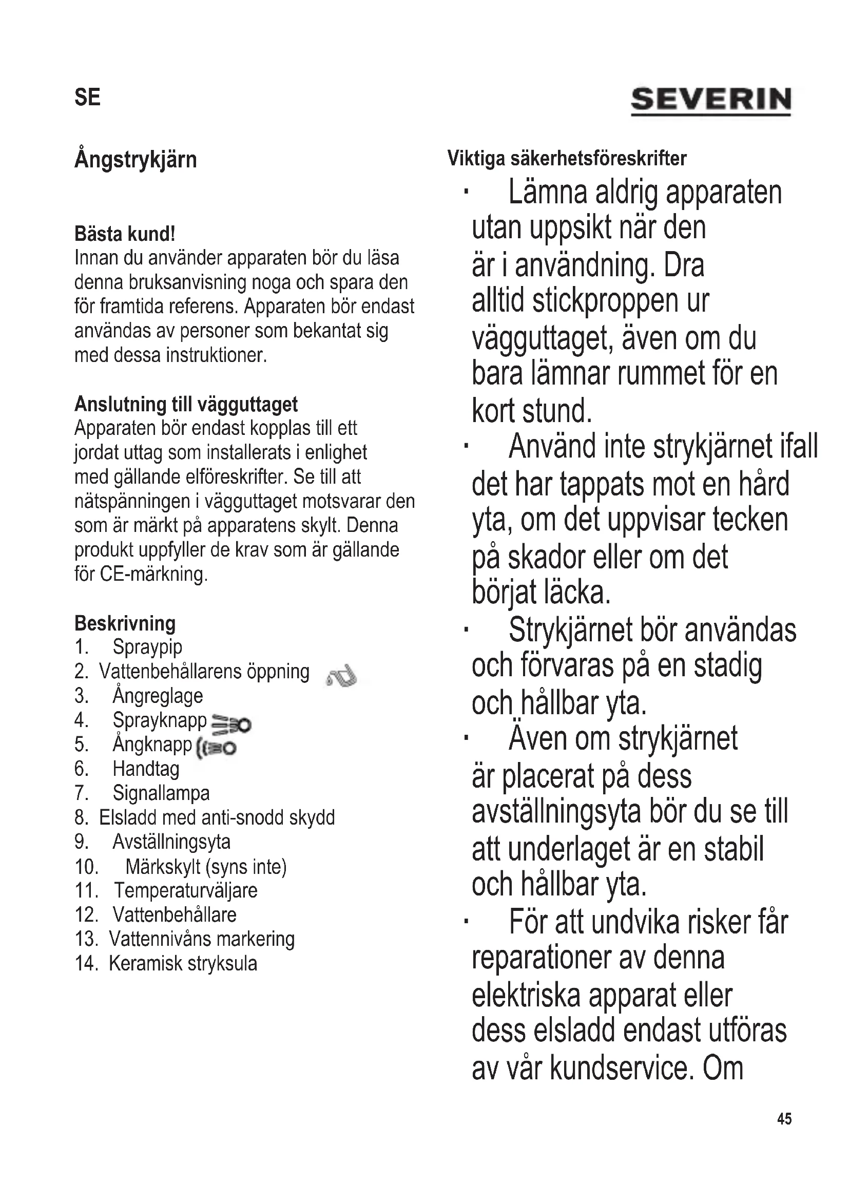 Ångstrykjärn Bästa kund! Innan du använder apparaten bör du läsa denna bruksanvisning noga och spara den för framtida referens. Apparaten bör endast användas av personer som bekantat sig med dessa instruktioner. Anslutning till vägguttaget Apparaten bör endast kopplas till ett jordat uttag som installerats i enlighet med gällande elföreskrifter. Se till att nätspänningen i vägguttaget motsvarar den som är märkt på apparatens skylt. Denna produkt uppfyller de krav som är gällande för CE-märkning. Beskrivning