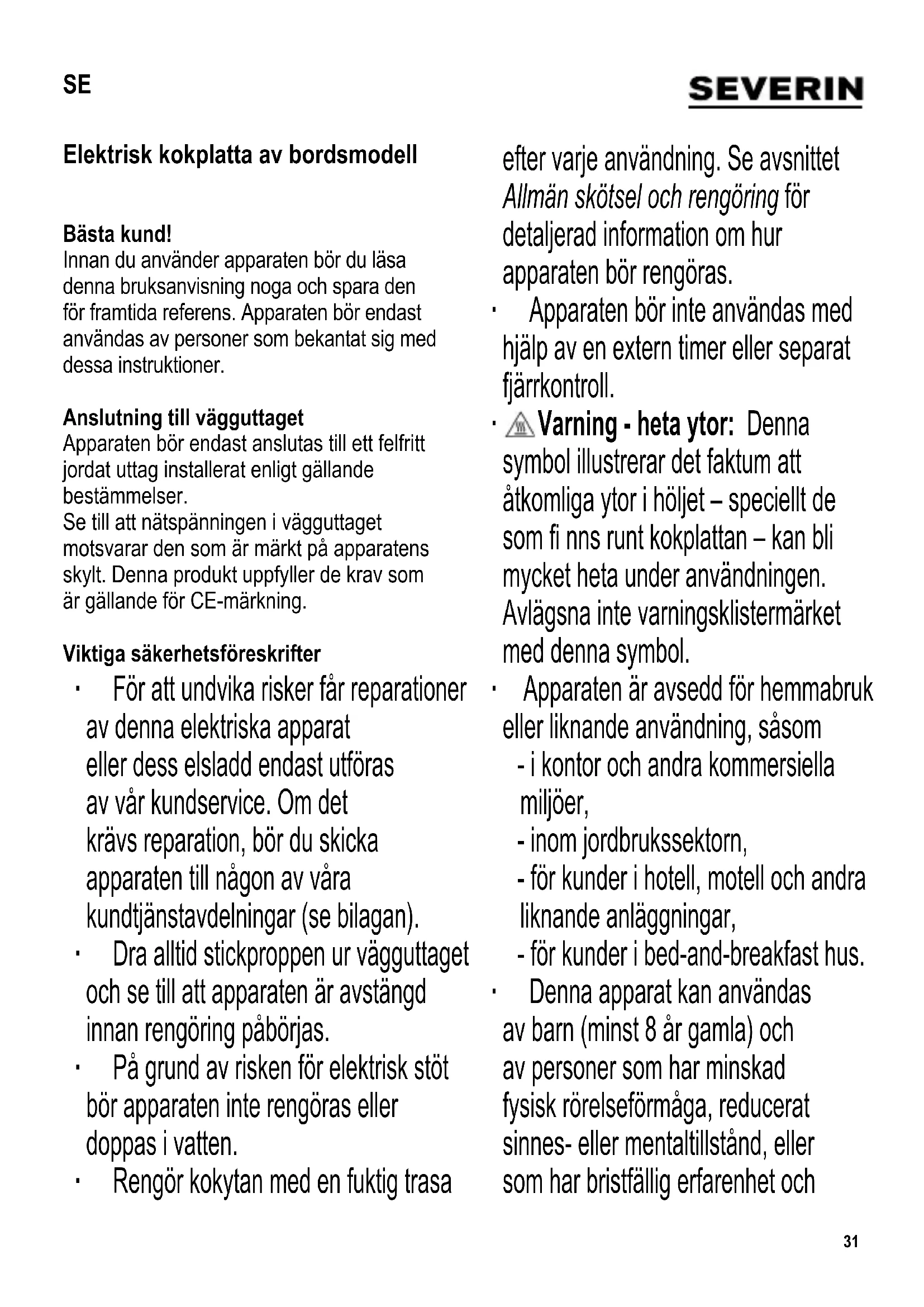 Varning - heta ytor: Denna symbol illustrerar det faktum att åtkomliga ytor i höljet – speciellt de som fi nns runt kokplattan – kan bli mycket heta under användningen. Avlägsna inte varningsklistermärket med denna symbol. ∙ Apparaten är avsedd för hemmabruk eller liknande användning, såsom - i kontor och andra kommersiella miljöer, - inom jordbrukssektorn, - för kunder i hotell, motell och andra liknande anläggningar, - för kunder i bed-and-breakfast hus. ∙ Denna apparat kan användas av barn (minst 8 år gamla) och av personer som har minskad fysisk rörelseförmåga, reducerat sinnes- eller mentaltillstånd, eller som har bristfällig erfarenhet och SE32 kunskap, förutsatt att dessa personer är under uppsyn eller har fått tillräckliga instruktioner beträffande apparatens användning och vet vilka risker och säkerhetsåtgärder som användningen innefattar. ∙ Barn bör inte tillåtas leka med apparaten. ∙ Barn bör inte tillåtas rengöra eller göra service på apparaten ifall de inte är övervakade och minst 8 år gamla. ∙ Apparaten och dess elsladd bör hållas utom räckhåll för barn under 8 år. ∙ Varning: Håll barn på avstånd från apparatens förpackningsmaterial eftersom fara eventuellt kan uppstå. Det fi nns t.ex. risk för kvävning. ∙ Innan varje användning bör apparaten samt dess elsladd och monterade tillbehör inspekteras noga så att de inte har några skador. Om apparaten t ex har tappats på en hård yta, eller om elsladden har utsatts för alltför hård kraft, bör den inte längre användas: Även osynliga skador kan försämra apparatens driftsäkerhet. ∙ Apparaten bör alltid vara under uppsikt när den är i användning. ∙ Varning: Mat kan antändas om den upphettas alltför mycket. Sannolikheten för att detta skall hända är dock större med mat som innehåller mycket fett eller olja. ∙ Placera inte apparaten eller använd apparaten nära eller under väggskåp eller hängande föremål såsom gardiner eller annat lättantändligt material. ∙ Vid användningen bör apparaten placeras på en värmebeständig yta som tål stänk, fl äckar eller het ånga. Se alltid till att luft kan cirkulera fritt under enheten. Det måste också fi nnas ett fritt utrymme på 10 cm från alla väggar. ∙ Ventilationsöppningarna under enheten får inte vara blockerade då apparaten är i användning. ∙ Dra alltid stickproppen ur vägguttaget - ifall apparaten skulle krångla, - efter användning, samt - innan apparaten rengörs. ∙ Tag stickproppen ur vägguttaget genom att dra i stickproppen, aldrig i sladden. ∙ Låt inte sladden hänga fritt. ∙ Se till att elsladden inte kommer i kontakt med apparatens heta ytor. ∙ Inget ansvar godtas om skada uppkommer till följd av felaktig användning, eller om dessa instruktioner inte följts. Uppstart Innan du använder apparaten för första gången bör du låta den värmas upp under ca 3 minuter på full effekt (men utan att använda en gryta eller kastrull), medan du vädrar tillräckligt. Under denna process kan en lätt lukt samt en liten mängd rök uppstå. Detta är normalt och varar endast en mycket kort tid. Vädra ordentligt genom att öppna fönster eller balkongdörrar. Rengör apparaten efteråt enligt avsnittet Allmän skötsel och rengöring nedan.33 Användning ∙ Placera alltid en gryta/kastrull på elplattan innan apparaten kopplas på. ∙ Se till att kärlet är rent och torrt på utsidan. Använd inte grytor/kastruller som är smutsiga. ∙ Undvik skador på kokplattan genom att bara använda kärl med plan botten. Kärl som är speciellt tillverkade för användning på elektriska kokplattor (se bild I) är mest lämpliga. ∙ Kontrollera alltid att den gryta/kastrull som används har minst samma diameter som plattan; detta minimerar värmeförlusten och förhindrar att plattan skadas p g a ojämn värmedistribution. Inställning av termostat MAX : Förkokning och snabbstekning 4-5 : Vanlig kokning, stekning 3-4 : Sakta kokning 1-2 : Håll varm Ställ termostatknappen på ‘MIN’ position efter användningen. Efter att du använt apparaten bör du försäkra dig om att apparaten är helt avstängd genom att dra stickproppen ur vägguttaget. Signallampa Signallampan lyser när plattan värms upp. Den slocknar när den förinställda temperaturen har uppnåtts. Allmän skötsel och rengöring ∙ Dra alltid stickproppen ur vägguttaget och se till att apparaten är avstängd innan rengöring påbörjas. ∙ På grund av risken för elektrisk stöt bör apparaten inte rengöras med vatten eller doppas i vatten. ∙ Använd inte slipmedel eller starka rengöringslösningar. ∙ Efter användningen kan du använda en våt trasa för att avlägsna eventuellt spill från plattorna. ∙ Ett specialrengöringsmedel bör användas för att behandla plattan emellanåt. Avfallshantering Enheter märkta med denna symbol måste kasseras separat från hushållsavfallet, eftersom de innehåller värdefulla material som kan återvinnas. Korrekt avfallshantering skyddar miljön och människors hälsa. Din lokala myndighet eller återförsäljare kan ge information i ärendet. Garanti i Sverige och Finland För material- och tillverkningsfel gäller 2 års garanti räknat från inköpsdagen mot uppvisande av specifi cerat inköpskvitto i överensstämmelse med de allmänna garantivillkoren. Denna garanti inverkar inte på dina lagstadgade rättigheter eller dina lagenliga rättigheter enligt den nationella konsumentskyddslagstiftningen. Ifall apparaten används felaktigt, eller vårdslöst, ansvarar den som använder apparaten för eventuella material- och personskador. Tillverkas för: Severin Elektrogeräte GmbH, Tyskland.34 Sähkölämpölevy Hyvä Asiakas, Lue seuraavat ohjeet huolellisesti ennen laitteen käyttöä ja säilytä tämä opas tulevaa tarvetta varten. Laitetta saavat käyttää vain henkilöt, jotka ovat tutustuneet näihin ohjeisiin. Verkkoliitä