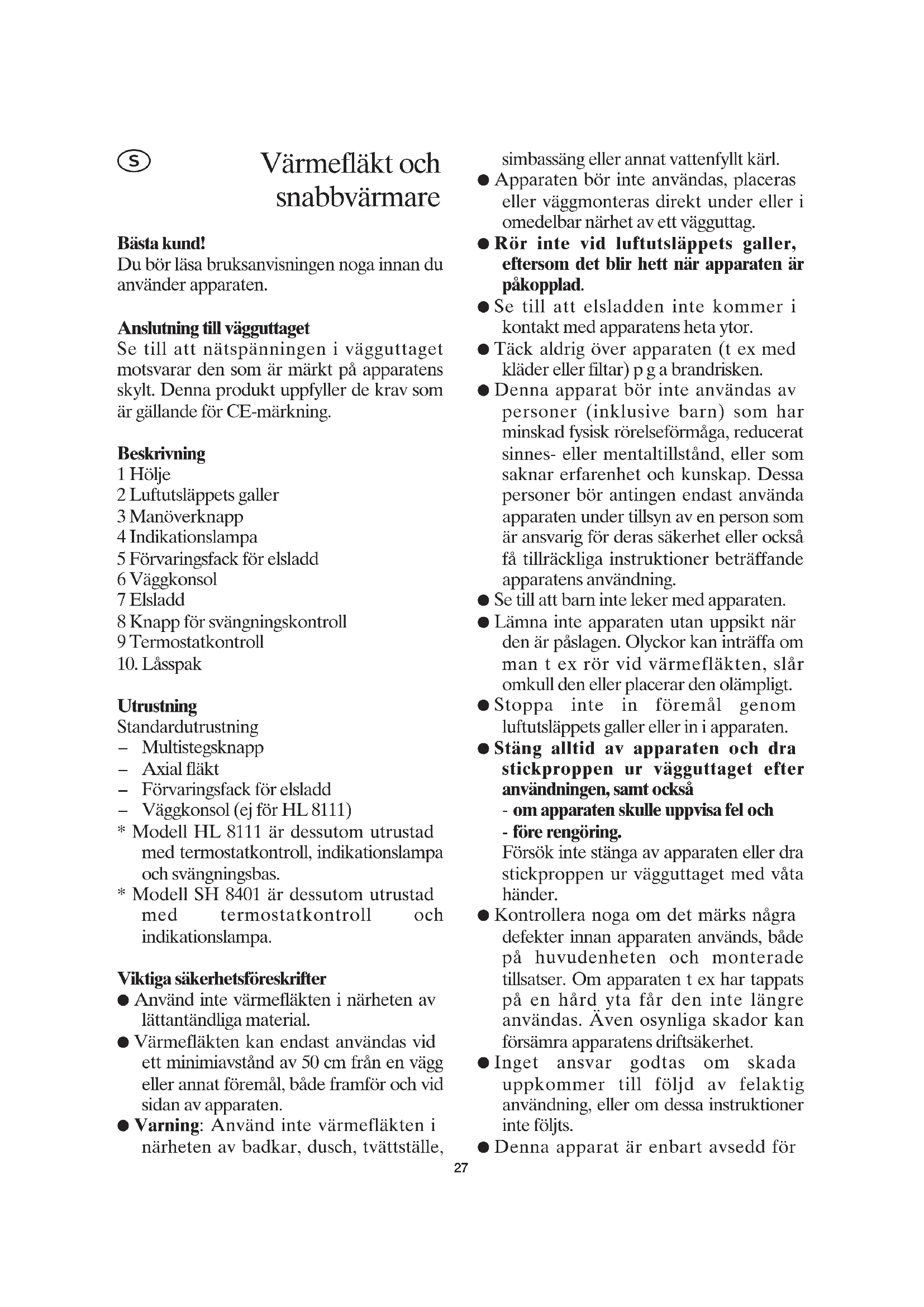 Lämna inte apparaten utan uppsikt nar den ar paaslagen. Olyckor kan inträffa om man tex rör vid varmefläkten, slär omkull den ell er placar den olampligt. - Stoppainte in foremål genom luftutslappets galler erler in i apparaten.