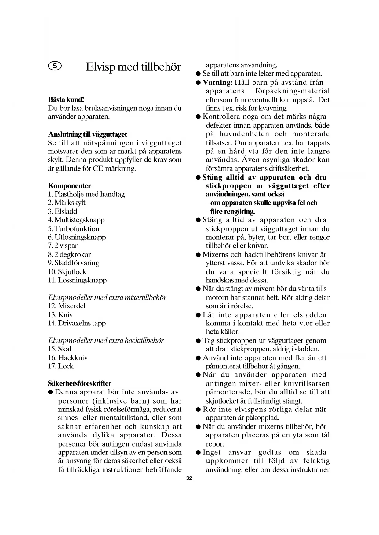 Apparaten ar konstruerad for att bereda normala kvantiteter mat i hemmet. När du använder hastigheterna 1 - 5,ör elvispen inte anvandas kontinuereglt mer aan 10 minutes. När du använder turbofunktionen fär apparaten inte anvandas mer aan 30 sekunder at gangen. Stäng av elvispen afterat och lat motorn kallna.