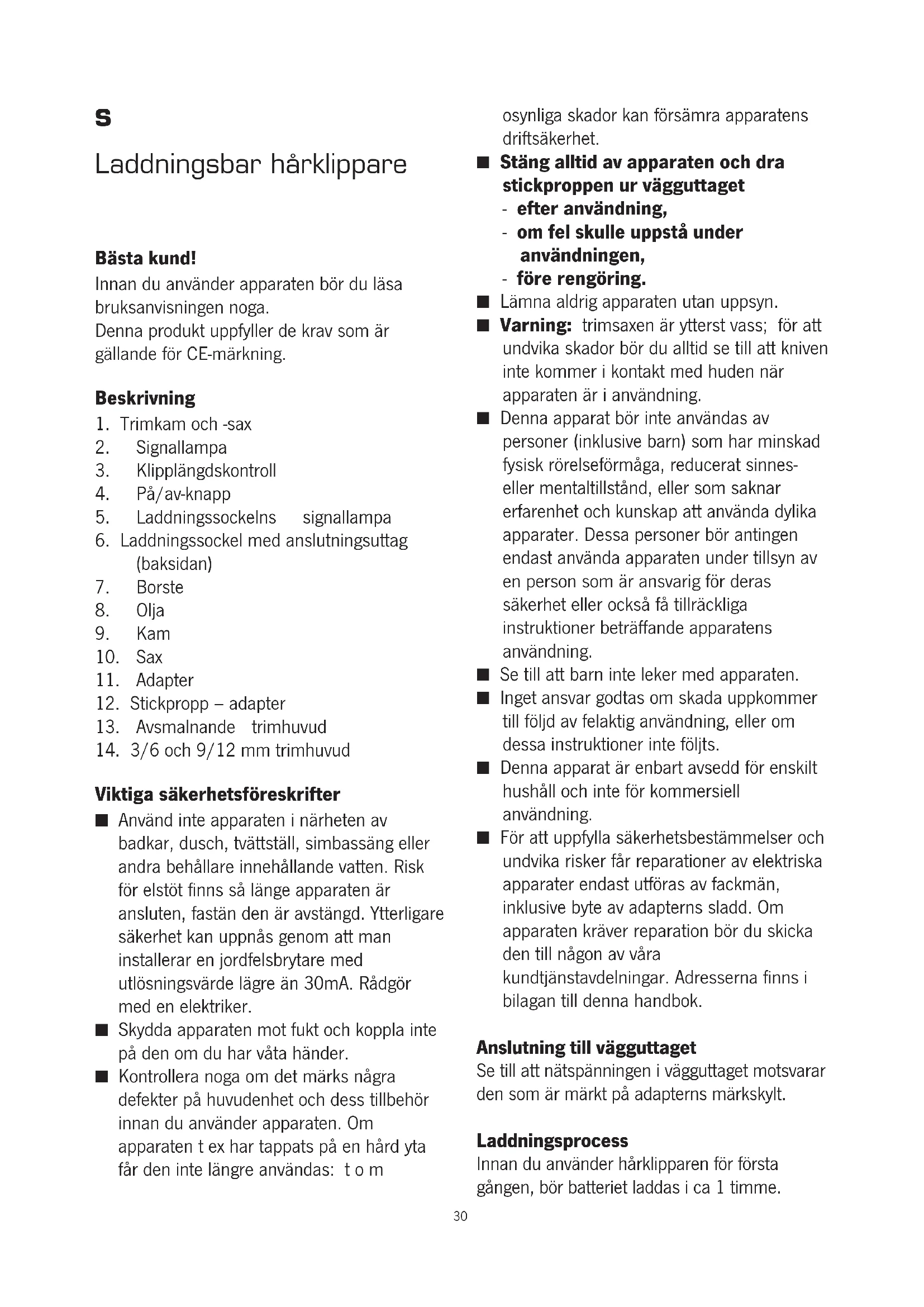 Viktiga säkerhetsföreskrifter ■ Använd inte apparaten i närheten av badkar, dusch, tvättställ, simbassäng eller andra behållare innehållande vatten. Risk för elstöt finns så länge apparaten är ansluten, fastän den är avstängd. Ytterligare säkerhet kan uppnås genom att man installerar en jordfelsbrytare med utlösningsvärde lägre än 30mA. Rådgör med en elektriker. ■ Skydda apparaten mot fukt och koppla inte på den om du har våta händer. ■ Kontrollera noga om det märks några defekter på huvudenhet och dess tillbehör innan du använder apparaten. Om apparaten t ex har tappats på en hård yta får den inte längre användas: t o m osynliga skador kan försämra apparatens driftsäkerhet. ■ Stäng alltid av apparaten och dra stickproppen ur vägguttaget - efter användning, - om fel skulle uppstå under användningen, - före rengöring. ■ Lämna aldrig apparaten utan uppsyn. ■ Varning: trimsaxen är ytterst vass; för att undvika skador bör du alltid se till att kniven inte kommer i kontakt med huden när apparaten är i användning. ■ Denna apparat bör inte användas av personer (inklusive barn) som har minskad fysisk rörelseförmåga, reducerat sinnes- eller mentaltillstånd, eller som saknar erfarenhet och kunskap att använda dylika apparater. Dessa personer bör antingen endast använda apparaten under tillsyn av en person som är ansvarig för deras säkerhet eller också få tillräckliga instruktioner beträffande apparatens användning. ■ Se till att barn inte leker med apparaten. ■ Inget ansvar godtas om skada uppkommer till följd av felaktig användning, eller om dessa instruktioner inte följts. ■ Denna apparat är enbart avsedd för enskilt hushåll och inte för kommersiell användning. ■ För att uppfylla säkerhetsbestämmelser och undvika risker får reparationer av elektriska apparater endast utföras av fackmän, inklusive byte av adapterns sladd. Om apparaten kräver reparation bör du skicka den till någon av våra kundtjänstavdelningar. Adresserna finns i bilagan till denna handbok. Anslutning till vägguttaget Se till att nätspänningen i vägguttaget motsvarar den som är märkt på adapterns märkskylt. Laddningsprocess Innan du använder hårklipparen för första gången, bör batteriet laddas i ca 1 timme. 30Apparaten kan dock laddas under längre tid utan att ta skada eller utgöra fara. Om du märker en betydande försämring i klippeffekt eller om signallampan börjar lysa rött, bör du stänga av apparaten och ladda batteriet på nytt.