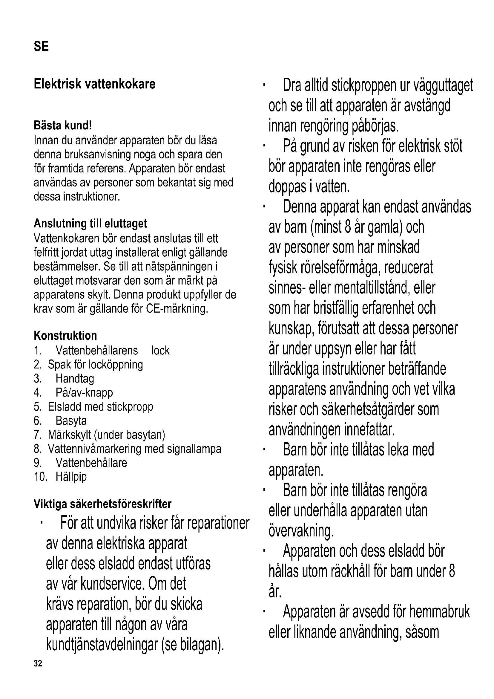 Viktiga säkerhetsföreskrifter ∙ För att undvika risker får reparationer av denna elektriska apparat eller dess elsladd endast utföras av vår kundservice. Om det krävs reparation, bör du skicka apparaten till någon av våra kundtjänstavdelningar (se bilagan). ∙ Dra alltid stickproppen ur vägguttaget och se till att apparaten är avstängd innan rengöring påbörjas. ∙ På grund av risken för elektrisk stöt bör apparaten inte rengöras eller doppas i vatten. ∙ Denna apparat kan endast användas av barn (minst 8 år gamla) och av personer som har minskad fysisk rörelseförmåga, reducerat sinnes- eller mentaltillstånd, eller som har bristfällig erfarenhet och kunskap, förutsatt att dessa personer är under uppsyn eller har fått tillräckliga instruktioner beträffande apparatens användning och vet vilka risker och säkerhetsåtgärder som användningen innefattar. ∙ Barn bör inte tillåtas leka med apparaten. ∙ Barn bör inte tillåtas rengöra eller underhålla apparaten utan övervakning. ∙ Apparaten och dess elsladd bör hållas utom räckhåll för barn under 8 år. ∙ Apparaten är avsedd för hemmabruk eller liknande användning, såsom SE33 - i kontor och andra kommersiella miljöer, - i företag inom jordbrukssektorn, - för gäster i hotell, motell och liknande inkvarteringsställen, - för gäster i bed-and-breakfast hus. ∙ Lämna inte vattenkokaren utan uppsikt när den är i användning. Använd endast rent vatten och observera märket för minimum/ maximum vattennivå när du fyller vatten i kokaren. Om apparaten överfylls kan kokande vatten stänka upp. ∙ Tänk också på att det föreligger risk för skållning på grund av het vattenånga. Vidrör därför inga andra delar av apparaten än dess handtag medan apparaten är i användning. ∙ Varning! Locket måste alltid vara stängt under kokprocessen och när hett vatten hälls ut. ∙ Vattenkokaren får bara användas tillsammans med sin medföljande underdel. ∙ Ta aldrig bort vattenbehållaren från basytan (eller sätt tillbaks den) medan apparaten är påkopplad. ∙ Varning: Håll barn på avstånd från apparatens förpackningsmaterial eftersom fara eventuellt kan uppstå. Det fi nns t.ex. risk för kvävning. ∙ Innan varje användning bör apparaten samt dess elsladd och monterade tillbehör inspekteras noga så att de inte har några skador. Om apparaten t ex har tappats på en hård yta, eller om elsladden har utsatts för alltför hård kraft, bör den inte längre användas: Även osynliga skador kan försämra apparatens driftsäkerhet. ∙ Använd vattenkokaren endast på en värmebeständig, plan yta. ∙ Använd inte apparaten under ett hängande väggskåp eller dylikt föremål, eftersom det fi nns risk för att ånga som bildas blir instängd därunder. ∙ Vattenkokarens yttre hölje blir hett under användningen och förblir varmt en tid även efter det att apparaten stängs av. ∙ Låt inte höljet eller elsladden komma i kontakt med öppen eld eller heta ytor såsom spisplattor. ∙ Låt inte elsladden hänga ner över bordskanten och se till att den inte kommer i kontakt med höljets heta delar. ∙ Dra alltid stickproppen ur vägguttaget - efter användning, - ifall apparaten skulle krångla, samt - innan apparaten rengörs. ∙ Inget ansvar godtas om skada uppkommer till följd av felaktig användning, eller om dessa instruktioner inte följts. Säkerhetsavstängning Det förinställda säkerhetsskyddet hindrar att värmeelementet blir överhettat ifall vattenkokaren skulle råka bli påslagen utan vatten eller om värmeelementet är34 förkalkat. När säkerhetsbrytaren har stängt av vattenkokaren bör du låta apparaten svalna eller kalka av den innan du kopplar på den igen. Innan första användningen ∙ Häll ut det kokta vattnet efter den första användningen för att säkerställa renligheten. Vattenkokning ∙ Ta bort vattenbehållaren från dess basyta. ∙ Öppna locket och fyll behållaren med vatten till önskad nivå. Observera min- och max-märkena. ∙ Stäng locket och placera behållaren tillbaka på dess basyta. Sätt stickproppen i ett lämpligt eluttag och tryck på på/ av-knappen; Vattennivåmarkeringens signallampa tänds. ∙ Kokprocessen börjar. Efter att ha uppnått kokpunkten kopplas apparaten ifrån automatiskt av den inbyggda ångavstängningsanordningen. En pipsignal hörs och signallampan slocknar. ∙ Om du vill avbryta kokprocessen ställer du på/av-knappen på läget »off». ∙ När du vill hälla ut hett vatten lyfter du vattenbehållaren av dess basyta. ∙ Du förhindrar att het ånga avges genom att se till att locket förblir stängt då du häller ut vattnet. ∙ Dra stickproppen ur eluttaget efter användningen. ∙ Lämna inte vatten i behållaren. Elsladdens förvaring Elsladden förvaras uppvirad under basplattan vilket gör att längden på elsladden lätt kan begränsas under användningen samt att förvaringen av apparaten underlättas. Avkalkning Beroende på vattenkvaliteten i ditt bostadsområde, kan det uppstå kalkavlagringar i vattenkokaren. Garantikrav godkänns inte om vattenkokaren slutar fungera på grund av otillräcklig avkalkning. Du kan använda en blandning av 0,5 liter vatten och 40 ml ättiksyra. ∙ Häll avkalkningsmedlet i apparaten. ∙ Koppla på vattenkokaren och låt lösningen nå kokpunkten. ∙ Låt det verka en kort stund. ∙ Tvätta behållaren efter avkalkningen genom att skölja den noggrant med rent vatten. ∙ Under avkalkningen bör du vädra tillräckligt och inte andas in ättiksångorna. ∙ Häll inte ut avkalkningsmedlet i emaljerade tvättställen. Sil Vid behov kan silen avlägsnas ur pipen för rengöring. Sätt tillbaka silen efteråt. Rengöring och underhåll ∙ Se till att vattenkokaren inte är kopplad till eluttaget och att den har svalnat helt innan apparaten rengörs. ∙ Undvik elektrisk stöt genom att inte tvätta vattenkokaren och basytan med va