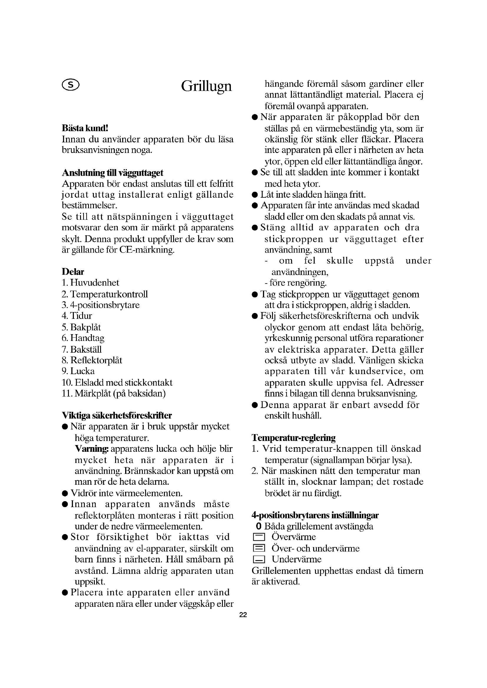 Viktiga säkerhetsföreskrifter ● När apparaten är i bruk uppstår mycket höga temperaturer. Varning: apparatens lucka och hölje blir mycket heta när apparaten är i användning. Brännskador kan uppstå om man rör de heta delarna. ● Vidrör inte värmeelementen. ● Innan apparaten används måste reflektorplåten monteras i rätt position under de nedre värmeelementen. ● Stor försiktighet bör iakttas vid användning av el-apparater, särskilt om barn finns i närheten. Håll småbarn på avstånd. Lämna aldrig apparaten utan uppsikt. ● Placera inte apparaten eller använd apparaten nära eller under väggskåp eller hängande föremål såsom gardiner eller annat lättantändligt material. Placera ej föremål ovanpå apparaten. ● När apparaten är påkopplad bör den ställas på en värmebeständig yta, som är okänslig för stänk eller fläckar. Placera inte apparaten på eller i närheten av heta ytor, öppen eld eller lättantändliga ångor. ● Se till att sladden inte kommer i kontakt med heta ytor. ● Låt inte sladden hänga fritt. ● Apparaten får inte användas med skadad sladd eller om den skadats på annat vis. ● Stäng alltid av apparaten och dra stickproppen ur vägguttaget efter användning, samt - om fel skulle uppstå under användningen, - före rengöring. ● Tag stickproppen ur vägguttaget genom att dra i stickproppen, aldrig i sladden. ● Följ säkerhetsföreskrifterna och undvik olyckor genom att endast låta behörig, yrkeskunnig personal utföra reparationer av elektriska apparater. Detta gäller också utbyte av sladd. Vänligen skicka apparaten till vår kundservice, om apparaten skulle uppvisa fel. Adresser finns i bilagan till denna bruksanvisning. ● Denna apparat är enbart avsedd för enskilt hushåll. Temperatur-reglering