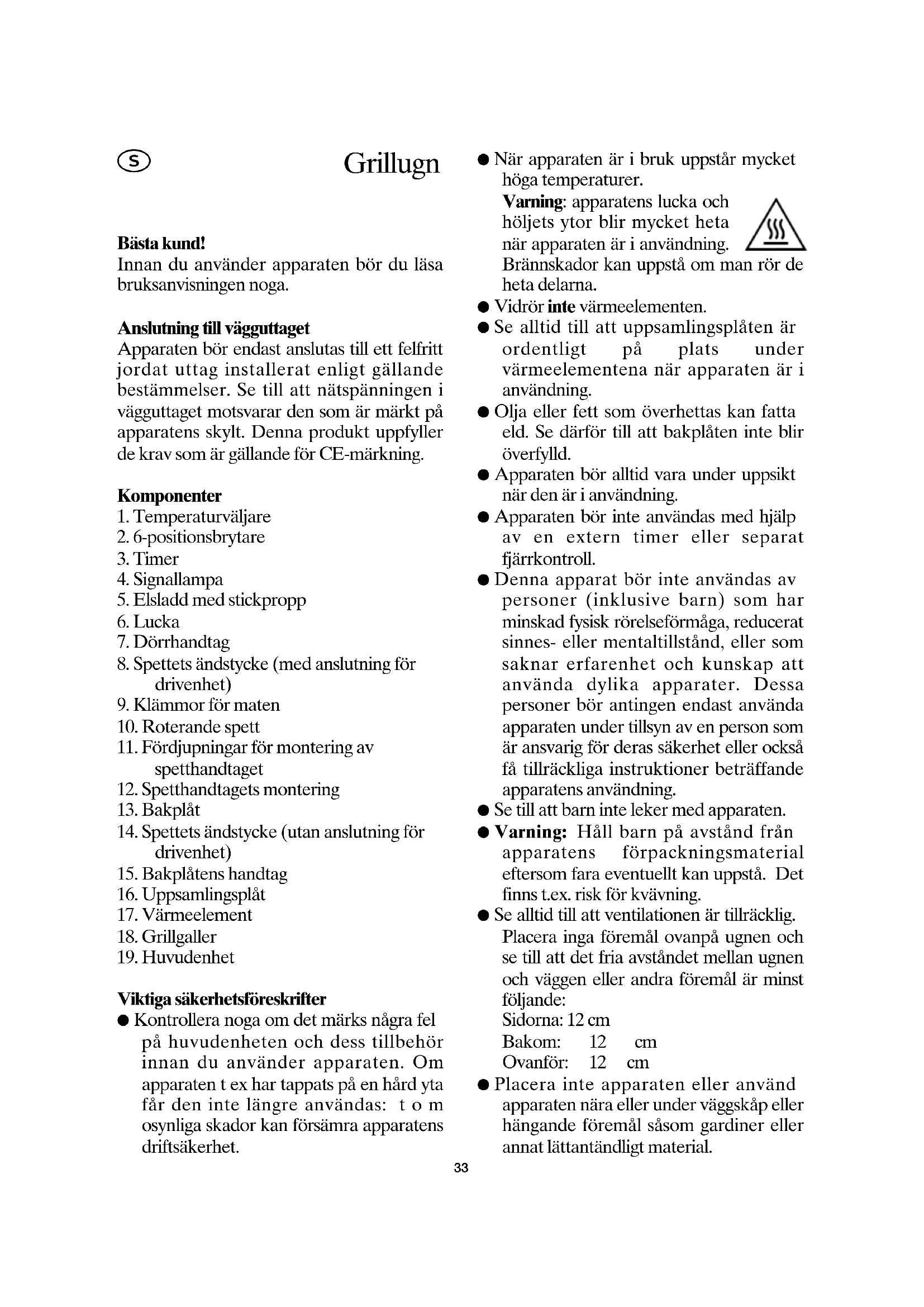 Viktiga säkerhetsföreskrifter ● Kontrollera noga om det märks några fel på huvudenheten och dess tillbehör innan du använder apparaten. Om apparaten t ex har tappats på en hård yta får den inte längre användas: t o m osynliga skador kan försämra apparatens driftsäkerhet. ● När apparaten är i bruk uppstår mycket höga temperaturer. Varning: apparatens lucka och höljets ytor blir mycket heta när apparaten är i användning. Brännskador kan uppstå om man rör de heta delarna. ● Vidrör inte värmeelementen. ● Se alltid till att uppsamlingsplåten är ordentligt på plats under värmeelementena när apparaten är i användning. ● Olja eller fett som överhettas kan fatta eld. Se därför till att bakplåten inte blir överfylld. ● Apparaten bör alltid vara under uppsikt när den är i användning. ● Apparaten bör inte användas med hjälp av en extern timer eller separat fjärrkontroll. ● Denna apparat bör inte användas av personer (inklusive barn) som har minskad fysisk rörelseförmåga, reducerat sinnes- eller mentaltillstånd, eller som saknar erfarenhet och kunskap att använda dylika apparater. Dessa personer bör antingen endast använda apparaten under tillsyn av en person som är ansvarig för deras säkerhet eller också få tillräckliga instruktioner beträffande apparatens användning. ● Se till att barn inte leker med apparaten. ● Varning: Håll barn på avstånd från apparatens förpackningsmaterial eftersom fara eventuellt kan uppstå. Det finns t.ex. risk för kvävning. ● Se alltid till att ventilationen är tillräcklig. Placera inga föremål ovanpå ugnen och se till att det fria avståndet mellan ugnen och väggen eller andra föremål är minst följande: Sidorna: 12 cm Bakom: 12 cm Ovanför: 12 cm ● Placera inte apparaten eller använd apparaten nära eller under väggskåp eller hängande föremål såsom gardiner eller annat lättantändligt material.