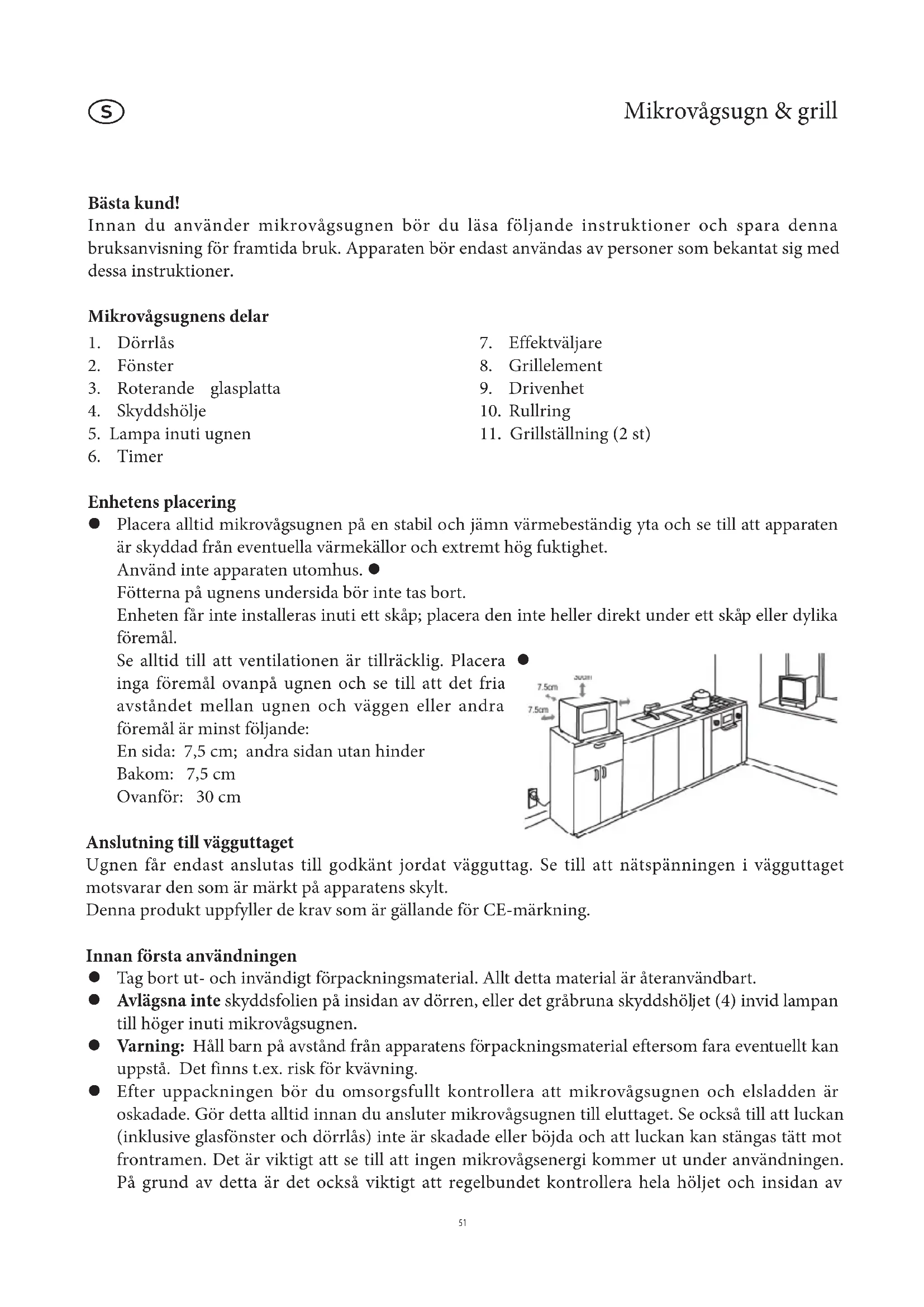 Enhetens placering Placera alltid mikrovågsugnen på en stabil och jämn värmebeständig yta och se till att apparaten z är skyddad från eventuella värmekällor och extremt hög fuktighet. Använd inte apparaten utomhus. z Fötterna på ugnens undersida bör inte tas bort. Enheten får inte installeras inuti ett skåp; placera den inte heller direkt under ett skåp eller dylika föremål. Se alltid till att ventilationen är tillräcklig. Placera z inga föremål ovanpå ugnen och se till att det fria avståndet mellan ugnen och väggen eller andra föremål är minst följande: En sida: 7,5 cm; andra sidan utan hinder Bakom: 7,5 cm Ovanför: 30 cm Anslutning till vägguttaget Ugnen får endast anslutas till godkänt jordat vägguttag. Se till att nätspänningen i vägguttaget motsvarar den som är märkt på apparatens skylt. Denna produkt uppfyller de krav som är gällande för CE-märkning. Innan första användningen Tag bort ut- och invändigt förpackningsmaterial. Allt detta material är återanvändbart. z Avlägsna inte z skyddsfolien på insidan av dörren, eller det gråbruna skyddshöljet (4) invid lampan till höger inuti mikrovågsugnen. Varning: z Håll barn på avstånd från apparatens förpackningsmaterial eftersom fara eventuellt kan uppstå. Det finns t.ex. risk för kvävning. Efter uppackningen bör du omsorgsfullt kontrollera att mikrovågsugnen och elsladden är z oskadade. Gör detta alltid innan du ansluter mikrovågsugnen till eluttaget. Se också till att luckan (inklusive glasfönster och dörrlås) inte är skadade eller böjda och att luckan kan stängas tätt mot frontramen. Det är viktigt att se till att ingen mikrovågsenergi kommer ut under användningen. På grund av detta är det också viktigt att regelbundet kontrollera hela höljet och insidan avugnen. Ifall en skada skulle uppstå bör inte apparaten användas innan den har reparerats av en kvalificerad tekniker. Innan produkten används för första gången, eller om den inte använts under en lång tid, bör den z rengöras noggrant enligt avsnittet Allmän skötsel och rengöring. Placera drivenheten, rullringen och den roterande glasplattan i enheten. z Innan du använder mikrovågsugnen för första gången, låt apparaten värmas upp på grilleffekt z (utan att mikrovågsfunktionen aktiveras) i cirka 10 minuter. Detta tar bort den typiska lukten som uppstår när man kopplar på en grill för första gången. Det kan uppstå litet rök och detta är helt normalt. Se till att vädra ordentligt. Anmärkning: Starta inte apparaten i mikrovågsfunktionen innan du har placerat maten som skall värmas eller tillredas inuti ugnen. Om mikrovågsugnen startas när den är tom kan den ta skada. Viktigt att veta När du värmer vätskor i din mikrovågsugn, kan vätskan hettas över kokpunkten utan att vätskan z börjar bubbla. Därför är det viktigt att du är ytterst försiktig när du handskas med olika kärl, t.ex. när du tar dem ur ugnen. Risken för sådan överhettning kan minskas genom att man placerar en värmebeständig glasstav i kärlet under värmningsprocessen. Hela ägg eller hela hårdkokta ägg får inte värmas i mikrovågsugn eftersom de kan explodera t o z m efter det att mikrovågsugnen stängts av. Varning z : det är även mycket farligt att värma upp vätskor eller matprodukter i stängda behållare i mikrovågsugnen p g a hög risk för explosion. Innehållet i nappflaskor eller glasburkar med babymat måste omröras eller skakas noggrant så att z temperaturen blir jämn. Kontrollera alltid matens temperatur innan du matar barnet så att brännskador kan undvikas. När du värmer eller tillagar mat i kärl som är gjorda av brännbart material såsom plast eller z papper, eller om maten är förpackad i dessa material, finns det en risk att materialen antänds. Det är även möjligt att maten blir uttorkad eller t.o.m. antänds om koktiden är för lång. Fett eller olja är också lättantändliga ämnen. Det är därför viktigt att man håller mikrovågsugnen under uppsikt under användningen. Mycket lättantändliga vätskor såsom koncentrerad alkohol får naturligtvis inte värmas. Om rök skulle uppstå under användningen, bör dörren hållas stängd för att hämma eller kväva z eventuella lågor. Stäng genast av mikrovågsugnen och dra stickproppen ur vägguttaget. För att undvika brännskador bör du alltid använda en lämplig grytvante när du tar ut mat ur z ugnen, eftersom redskap och kokkärl blir heta. De blir inte bara heta när grillen används, utan också vid mikrovågsugnens användning. Stektermometrar (som används i vanliga bakugnar) är inte lämpliga för användning i z mikrovågsugnar. Viktiga säkerhetsinstruktioner Varning: vissa typer av matprodukter kan fatta eld. Lämna inte apparaten utan tillsyn när den är i z användning. Denna mikrovågsugn är endast ämnad för upptining, värmning och tillagning av mat. Inget z ansvar accepteras för skada som uppstått genom otillbörlig användning eller om dessa instruktioner inte åtföljts. Apparaten bör inte användas med hjälp av en extern timer eller separat fjärrkontroll. z 52Denna apparat bör inte användas av personer (inklusive barn) som har minskad fysisk z rörelseförmåga, reducerat sinnes- eller mentaltillstånd, eller som saknar erfarenhet och kunskap att använda dylika apparater. Dessa personer bör antingen endast använda apparaten under tillsyn av en person som är ansvarig för deras säkerhet eller också få tillräckliga instruktioner beträffande apparatens användning. Se till att barn inte leker med apparaten. z Varning z : barns användning av mikrovågsugnen bör inte tillåtas utan en vuxens tillsyn, om inte noggranna och klara instruktioner har givits innan användningen så att barnet kan använda mikrovågsugnen på ett säkert sätt. Man bör dessutom få barnet att inse att faror kan uppstå som ett resultat av felaktig användning eller om i