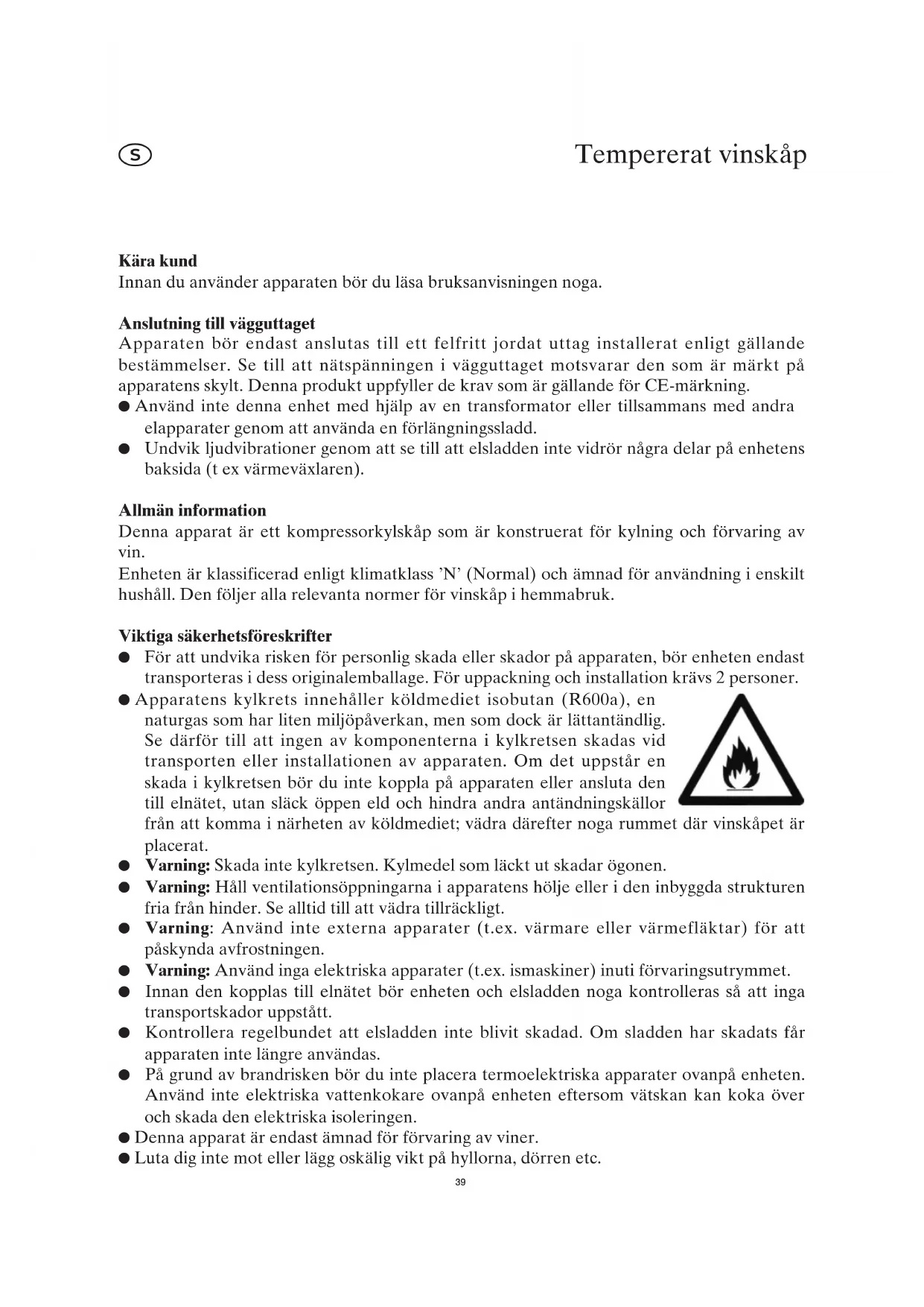 - Apparatens kylkrets innehåller köldmediet isobutan (R600a), en naturgas som har liten miljöpåverkan, men som dock är lättantändlig. Se därför till att ingen av komponenterna i kylkretsen skadas vid transporten eller installationen av apparaten. Om det uppstår en skada i kylkretsen bör du inte koppla på apparaten eller ansluta den till elnätet, utan släck öppen eld och hindra andra antändningskällor