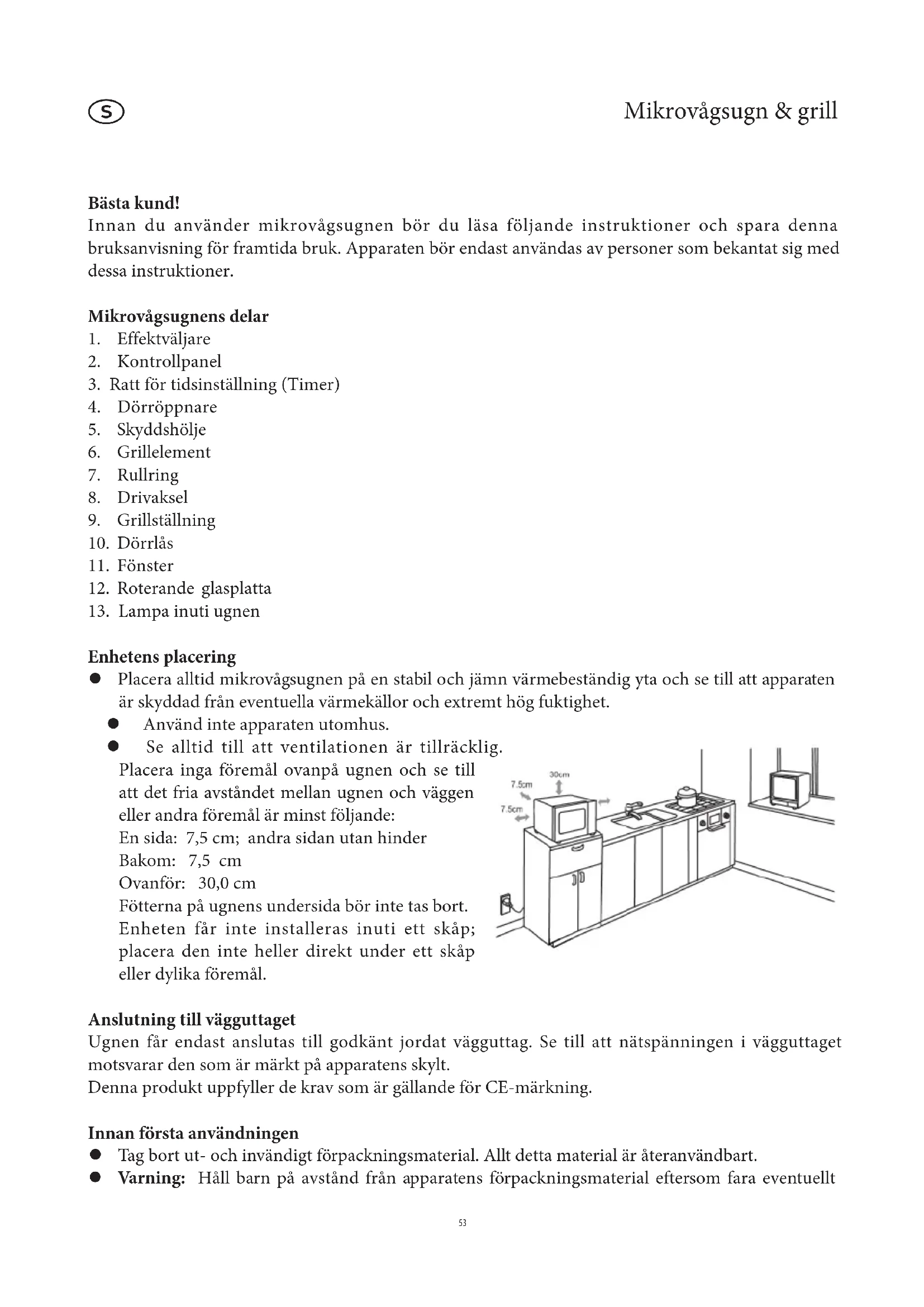 Enhetens placering Placera alltid mikrovågsugnen på en stabil och jämn värmebeständig yta och se till att apparaten är skyddad från eventuella värmekällor och extremt hög fuktighet. Använd inte apparaten utomhus. Se alltid till att ventilationen är tillräcklig. Placera inga föremål ovanpå ugnen och se till att det fria avståndet mellan ugnen och väggen eller andra föremål är minst följande: En sida: 7,5 cm; andra sidan utan hinder Bakom: 7,5 cm Ovanför: 30,0 cm Fötterna på ugnens undersida bör inte tas bort. Enheten får inte installeras inuti ett skåp; placera den inte heller direkt under ett skåp eller dylika föremål. Anslutning till vägguttaget Ugnen får endast anslutas till godkänt jordat vägguttag. Se till att nätspänningen i vägguttaget motsvarar den som är märkt på apparatens skylt. Denna produkt uppfyller de krav som är gällande för CE-märkning. Innan första användningen Tag bort ut- och invändigt förpackningsmaterial. Allt detta material är återanvändbart. Varning: Håll barn på avstånd från apparatens förpackningsmaterial eftersom fara eventuellt
