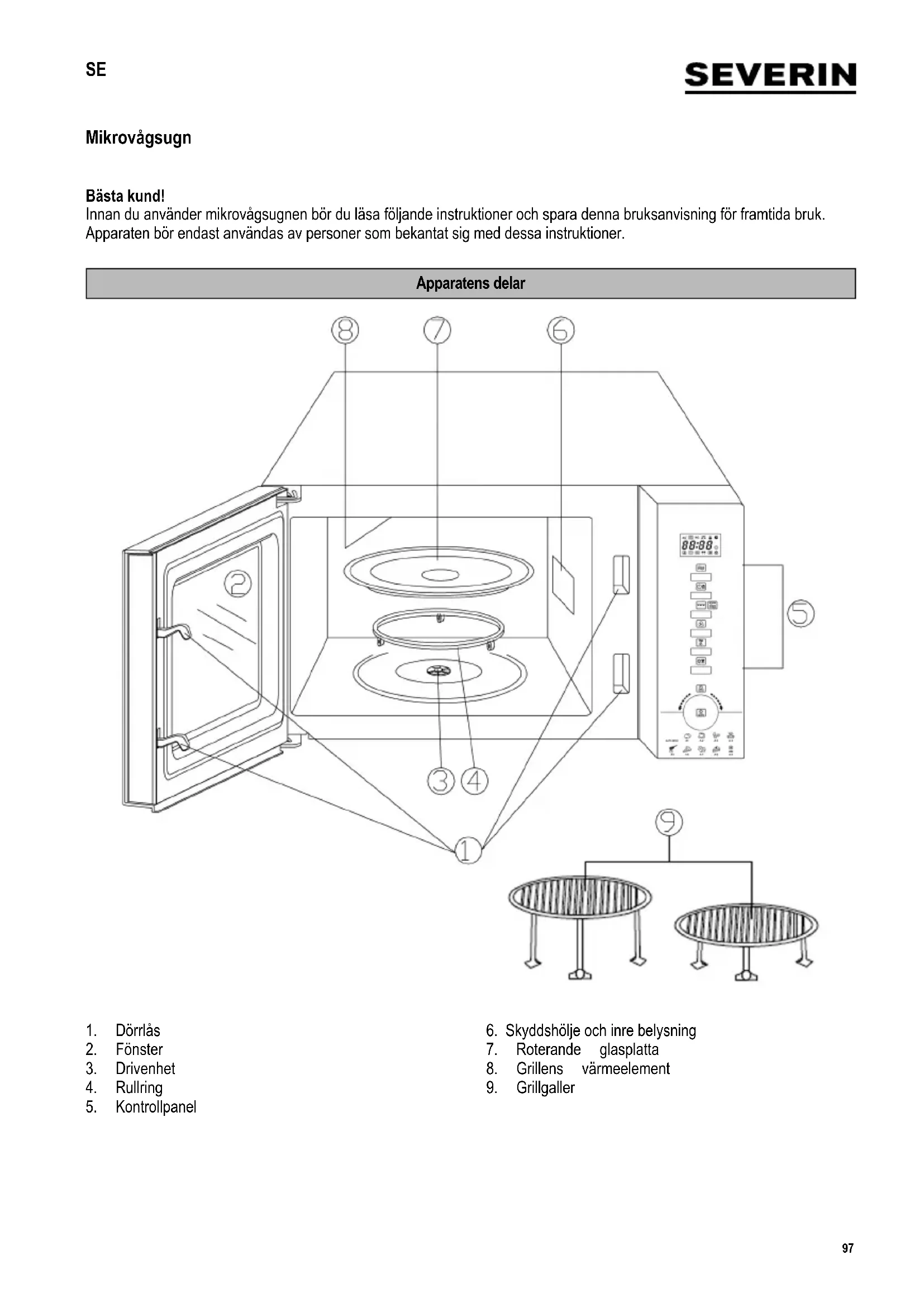 för att påbörja programmet. Displayen visar det valda programmets funktionstid. Meny Vikt (g) Effektinställningar A-1 Bakad potatis 230 g 1 460 g 2 690 g 3 A-2 Drycker 200 ml 1 400 ml 2 600 ml 3 A-3 Popcorn 99 g 99 A-4 Uppvärmning 200 g 200 300 g 300 400 g 400 500 g 500 600 g 600 700 g 700 800 g 800 A-5 Nudlar, pasta 100 g (i kallt vatten, 400 ml) 100 200 g (i kallt vatten, 800 ml) 200 300 g (i kallt vatten, 1200 ml) 300108 A-6 Pizza 150 g 150 300 g 300 450 g 450 A-7 Grillad kyckling 800 g 800 1000 g 1000 1200 g 1200 1400 g 1400 A-8 Kaka 475 g 475 A-9 Upptining Upptiningsprogram A-1 Bakad potatis Lägg den råa, oskalade potatisen på en lämplig tallrik och placera den i mitten av ugnen. A-2 Drycker För att värma upp drycker och varmvatten för te eller snabbkaffe. A-3 Popcorn För mikrovågspopcorn (tillgänglig i påse). Se tillverkarens instruktioner på förpackningen. A-4 Uppvärmning För uppvärmning av fast mat. A-5 Nudlar/pasta Lägg pastan i en passlig behållare och täck med kallt vatten, placera behållaren på glasplattan. A-6 Pizza För tillagning av djupfryst pizza. Låt alltid apparaten förvärmas enligt tillverkarens instruktioner, som fi nns på förpackningen, och välj sedan ett lämpligt automatiskt program. Använd den lägre grillställningen. A-7 Ugnsbakad kyckling Lägg en hel kyckling i en lämplig behållare i mitten av ugnen. Fyra pipsignaler hörs när 2/3 av den förinställda programtiden har förfl utit och tillagningen avbryts. Vänd på kycklingen och tryck på vridreglaget för att återuppta tillagningen. A-8 Kaka Detta program är lämpligt för att baka enkla kakor. Vänligen kontrollera ditt kakrecept för information om den nödvändiga förvärmningstiden. Lägg degen i en bakform och sätt formen på glasplattan. A-9 Upptining Se Upptiningsprogram i denna bruksanvisning. Barnsäkerhetsspärr: Denna säkerhetsspärr hindrar barn från att starta apparaten utan uppsikt. För att aktivera säkerhetsspärren tryck ner i 3 sekunder. Symbolen visas på displayen. För att ta bort säkerhetsspärren tryck åter ner i 3 sekunder. Symbolen försvinner. Anm.: Ifall du får svårigheter med att starta apparaten bör du först kontrollera att säkerhetsanordningen inte är aktiverad. Invändig lampa: En invändiga lampa tänds när dörren öppnas; den lyser under apparatens användning. Om ett program avslutas kommer lampan att slockna.109 Rengöring ∙ Innan du rengör apparaten, bör du se till den inte är kopplad till eluttaget och att den har svalnat fullständigt. ∙ Rengör inte ugnen med vatten. Låt inte vatten – oavsett hur liten vattenmängden är – komma in i ventilationsöppningarna på in- och utsidan av ugnen. Använd inga ångapparater för att rengöra ugnen. ∙ Hela mikrovågsugnen kan avtorkas med en lätt fuktad luddfri trasa och ett milt rengöringsmedel. Torka torrt efteråt. ∙ Använd inga slipmedel eller starka rengöringsmedel. Kommersiellt framställda ugnsrengöringsprodukter för vanliga ugnar, exempelvis spray, får inte användas. ∙ De inre ytorna måste rengöras noggrant efter varje användning. Insidan av dörren, dörrkarmen, rullringen samt ledskenorna under glasplattan bör alltid hållas rena. ∙ Grillställningarna, glasplattan och rullringen/drivenheten kan rengöras med varmt diskvatten. Ytterligare information Teknisk specifi kation Yttre dimensioner: 487 mm höjd 460 mm bredd 281 mm djup Inre dimensioner: ∙ glasplatta: Ø 270 mm ∙ fritt utrymme ovanför glasplattan: 170 mm Ugnens vikt: 15,3 kg Nätspänning: 230 - 240V~ 50 Hz Effektförbrukning: 1950 W ∙ grill 1900 W ∙ mikrovågsugn 1400 W ∙ varmluftsfunktion 1950 W Mikrovågseffekt: 90 W - 900 W Avfallshantering Enheter märkta med denna symbol måste kasseras separat från hushållsavfallet, eftersom de innehåller värdefulla material som kan återvinnas. Korrekt avfallshantering skyddar miljön och människors hälsa. Din lokala myndighet eller återförsäljare kan ge information i ärendet. Garanti i Sverige och Finland För material- och tillverkningsfel gäller 2 års garanti räknat från inköpsdagen mot uppvisande av specifi cerat inköpskvitto i överensstämmelse med de allmänna garantivillkoren. Denna garanti inverkar inte på dina lagstadgade rättigheter eller dina lagenliga rättigheter enligt den nationella konsumentskyddslagstiftningen. Ifall apparaten används felaktigt, eller vårdslöst, ansvarar den som använder apparaten för eventuella material- och personskador. Tillverkas för: Severin Elektrogeräte GmbH, Tyskland.110 Mikroaaltouuni Hyvä Asiakas, Lue seuraavat ohjeet huolellisesti ennen mikrouunin käyttämistä. Talleta ohjeet vastaisen varalle. Laitetta saavat käyttää vain henkilöt, jotka ovat tutustuneet näihin ohjeisiin. Laitteen osat