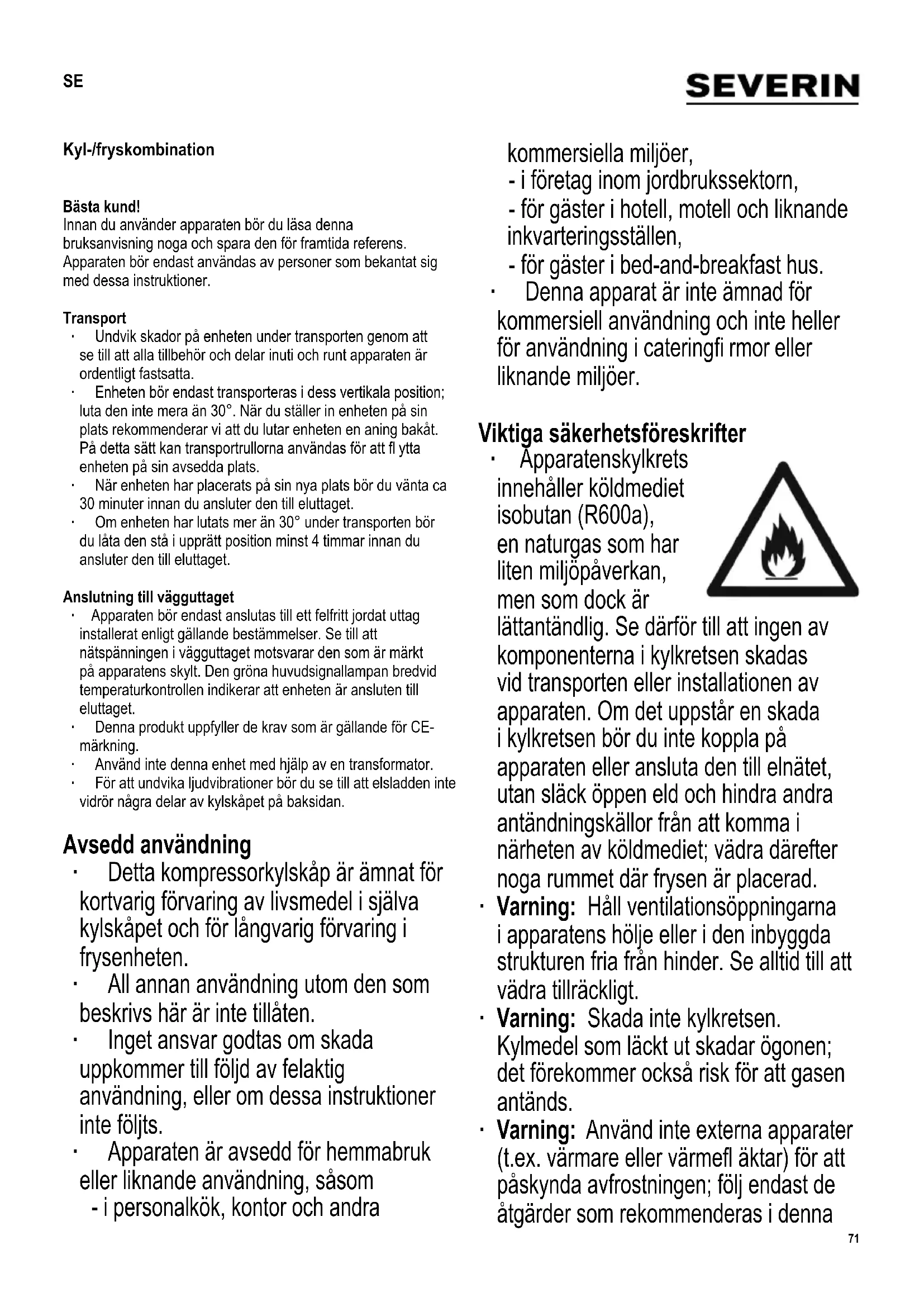 - I overensstemmelse med EU-direktiv 1062/2010 Bilag III ** Det faktiske forbrug afhænger af forbrugsmønstret og placeringen af apparatet Hvilken information har Kundeservice afdelingen brug for Hvis det skulle blive nødvendigt at reparere apparatet, bør man først tage kontakt med vores afdeling for Kundeservice, og sørge for at give en detaljeret beskrivelse af fejlen og oplyse hvilket artikel nr. KS… , der står på typeskiltet (se billedet). Denne information vil hjælpe os med at behandle en forespørgsel mest mulig effektivt. I tilfælde af fejlfunktion eller problemer med apparatet, bedes man tage kontakt til vores afdeling for Kundeservice. Adressen fi ndes i tillægget til denne brugsanvisning.71 Kyl-/fryskombination Bästa kund! Innan du använder apparaten bör du läsa denna bruksanvisning noga och spara den för framtida referens. Apparaten bör endast användas av personer som bekantat sig med dessa instruktioner. Transport ∙ Undvik skador på enheten under transporten genom att se till att alla tillbehör och delar inuti och runt apparaten är ordentligt fastsatta. ∙ Enheten bör endast transporteras i dess vertikala position; luta den inte mera än 30°. När du ställer in enheten på sin plats rekommenderar vi att du lutar enheten en aning bakåt. På detta sätt kan transportrullorna användas för att fl ytta enheten på sin avsedda plats. ∙ När enheten har placerats på sin nya plats bör du vänta ca 30 minuter innan du ansluter den till eluttaget. ∙ Om enheten har lutats mer än 30° under transporten bör du låta den stå i upprätt position minst 4 timmar innan du ansluter den till eluttaget. Anslutning till vägguttaget ∙ Apparaten bör endast anslutas till ett felfritt jordat uttag installerat enligt gällande bestämmelser. Se till att nätspänningen i vägguttaget motsvarar den som är märkt på apparatens skylt. Den gröna huvudsignallampan bredvid temperaturkontrollen indikerar att enheten är ansluten till eluttaget. ∙ Denna produkt uppfyller de krav som är gällande för CE- märkning. ∙ Använd inte denna enhet med hjälp av en transformator. ∙ För att undvika ljudvibrationer bör du se till att elsladden inte vidrör några delar av kylskåpet på baksidan. Avsedd användning ∙ Detta kompressorkylskåp är ämnat för kortvarig förvaring av livsmedel i själva kylskåpet och för långvarig förvaring i frysenheten. ∙ All annan användning utom den som beskrivs här är inte tillåten. ∙ Inget ansvar godtas om skada uppkommer till följd av felaktig användning, eller om dessa instruktioner inte följts. ∙ Apparaten är avsedd för hemmabruk eller liknande användning, såsom - i personalkök, kontor och andra kommersiella miljöer, - i företag inom jordbrukssektorn, - för gäster i hotell, motell och liknande inkvarteringsställen, - för gäster i bed-and-breakfast hus. ∙ Denna apparat är inte ämnad för kommersiell användning och inte heller för användning i cateringfi rmor eller liknande miljöer. Viktiga säkerhetsföreskrifter ∙ Apparatens kylkrets innehåller köldmediet isobutan (R600a), en naturgas som har liten miljöpåverkan, men som dock är lättantändlig. Se därför till att ingen av komponenterna i kylkretsen skadas vid transporten eller installationen av apparaten. Om det uppstår en skada i kylkretsen bör du inte koppla på apparaten eller ansluta den till elnätet, utan släck öppen eld och hindra andra antändningskällor från att komma i närheten av köldmediet; vädra därefter noga rummet där frysen är placerad. ∙ Varning: Håll ventilationsöppningarna i apparatens hölje eller i den inbyggda strukturen fria från hinder. Se alltid till att vädra tillräckligt. ∙ Varning: Skada inte kylkretsen. Kylmedel som läckt ut skadar ögonen; det förekommer också risk för att gasen antänds. ∙ Varning: Använd inte externa apparater (t.ex. värmare eller värmefl äktar) för att påskynda avfrostningen; följ endast de åtgärder som rekommenderas i denna SE72 bruksanvisning. ∙ Varning: Använd inga andra elapparater (t.ex. ismaskiner) inuti frysen ifall detta inte är specifi cerat enligt denna bruksanvisning. ∙ Innan den kopplas till elnätet bör enheten och elsladden noga kontrolleras så att inga transportskador uppstått. Ifall du upptäcker en sådan skada bör apparaten inte anslutas till elnätet. ∙ Denna apparat är inte ämnad för förvaring av explosiva ämnen såsom sprayfl askor med ett lättantändligt drivmedel. ∙ Om enheten blir såld, överlåten till tredje part eller lämnad till en lämplig återvinningsstation bör man observera att apparaten innehåller blåsmedlet ’cyclopentan’ samt frysmediet R600a. Mer information om korrekt återvinning hittar du i avsnittet Bortskaffning. ∙ Följ säkerhetsföreskrifterna och undvik risker genom att låta behörig servicepersonal utföra reparationer eller ändringar beträffande denna apparat, inklusive byte av elsladd. ∙ Denna apparat kan endast användas av barn (minst 8 år gamla) och av personer som har minskad fysisk rörelseförmåga, reducerat sinnes- eller mentaltillstånd, eller som har bristfällig erfarenhet och kunskap, förutsatt att dessa personer är under uppsyn eller har fått tillräckliga instruktioner beträffande apparatens användning och vet vilka risker och säkerhetsåtgärder som användningen innefattar. ∙ Barn bör inte tillåtas leka med apparaten. ∙ Barn bör inte tillåtas rengöra eller underhålla apparaten utan övervakning. ∙ För alldaglig rengöring rekommenderar vi att varmt vatten och ett milt rengöringsmedel används. Alla tillbehör bör tvättas separat i tvålvatten. Tvätta dem inte i diskmaskinen! ∙ Varning: Avlägsna inte den invändiga LED-lampans hölje. Om lampan inte fungerar bör du kontakta kundservice för assistens (se bilagan). ∙ För att undvika risken för personlig skada eller skador på frysen, bör frysen endast transportera
