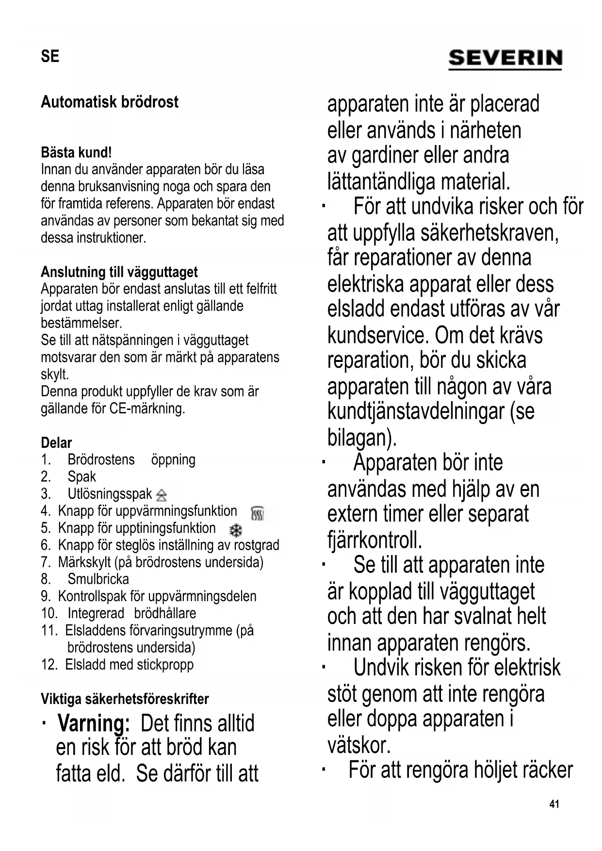 tänds. ∙ När den önskade rostningsnivån uppnåtts stängs rosten automatiskt av och brödskivorna stöts ut och kan tas bort. Signallampan slocknar. ∙ För att uppnå en jämn rostning när du rostar fl era skivor i följd, bör du låta brödrosten svalna i 60 - 90 sekunder mellan rostningarna. ∙ Täck inte över brödrostens öppning när apparaten är i bruk. Upptiningsfunktion När du använder brödrosten för att rosta djupfryst bröd, kan du också använda upptiningsfunktionen ( ). Denna funktion förlänger rostningsprocessen. En kontrollampa indikerar denna funktion. Uppvärmningsfunktion Uppvärmningsfunktionen ( ) är lämplig för att åter värma upp rostat bröd. Varning: Värm inte upp bröd som du brett smör på. När rostningsfunktionen har aktiverats kan dessutom värmefunktionen användas. Denna funktion indikeras av en röd lampa. Så avbryts rostningen Tryck på utlösningsspaken ( ) om du vill avbryta rostningen. Brödrosten kommer att stängas av och brödskivorna skjuts ut. Signallampan slocknar. Att värma bullar, småfranska etc. ∙ Då du vill värma bullar, småfranska eller andra bageriprodukter trycker du ner kontrollspaken för uppvärmningsdelen så långt det går för att höja på brödhållaren. ∙ Placera de bageriprodukter du vill värma upp på ställningen, justera inställningsknappen för rostning till medium inställning och tryck ner startspaken för att sätta igång brödrosten. ∙ När rostningen är klar och brödrosten har stängts av automatiskt, vänder du på brödet och upprepar proceduren. ∙ Efter rostningen sätter du tillbaka brödhållaren i ursprungsläget genom att trycka spaken uppåt. ∙ Placera inte bageriprodukterna direkt på brödrostens öppning. Skötsel och rengöring ∙ Kontrollera att brödrosten inte är ansluten till vägguttaget och att den är helt avsvalnad innan rengöringen påbörjas. ∙ Undvik risken för elektrisk stöt genom att inte rengöra eller doppa apparaten i vätskor. ∙ Använd inte repande eller frätande rengöringsmedel. ∙ Höljet kan torkas av med en torr eller lätt fuktad luddfri trasa.45 Smulfatet Under användningen av brödrosten kommer brödsmulor att samlas upp på smulfatet. Ta bort fatet för tömning genom att dra ut det åt brödrostens sida. Kontrollera att smulfatet har lagts tillbaka på sin plats innan brödrosten används igen. Utrymme för elsladd Dra ut elsladden helt innan brödrosten tas i bruk och se till att sladden inte kommer i kontakt med apparaten. Låt brödrosten svalna tillräckligt innan sladden viras upp efter användningen. Avfallshantering Enheter märkta med denna symbol måste kasseras separat från hushållsavfallet, eftersom de innehåller värdefulla material som kan återvinnas. Korrekt avfallshantering skyddar miljön och människors hälsa. Din lokala myndighet eller återförsäljare kan ge information i ärendet. Garanti i Sverige och Finland För material- och tillverkningsfel gäller 2 års garanti räknat från inköpsdagen mot uppvisande av specifi cerat inköpskvitto i överensstämmelse med de allmänna garantivillkoren. Denna garanti inverkar inte på dina lagstadgade rättigheter eller dina lagenliga rättigheter enligt den nationella konsumentskyddslagstiftningen. Ifall apparaten används felaktigt, eller vårdslöst, ansvarar den som använder apparaten för eventuella material- och personskador. Tillverkas för: Severin Elektrogeräte GmbH, Tyskland.46 Automaattinen leivänpaahdin Hyvä Asiakas, Lue seuraavat ohjeet huolellisesti ennen laitteen käyttöä ja säilytä tämä opas tulevaa tarvetta varten. Laitetta saavat käyttää vain henkilöt, jotka ovat tutustuneet näihin ohjeisiin. Verkkoliitäntä Laite tulee liittää määräysten mukaisesti asennettuun, maadoitettuun pistorasiaan. Varmista, että verkkojännite vastaa laitteen arvokilpeen merkittyä jännitettä. Tämä tuote on kaikkien voimassa olevien CE-merkintöjä koskevien direktiivien mukainen. Osat