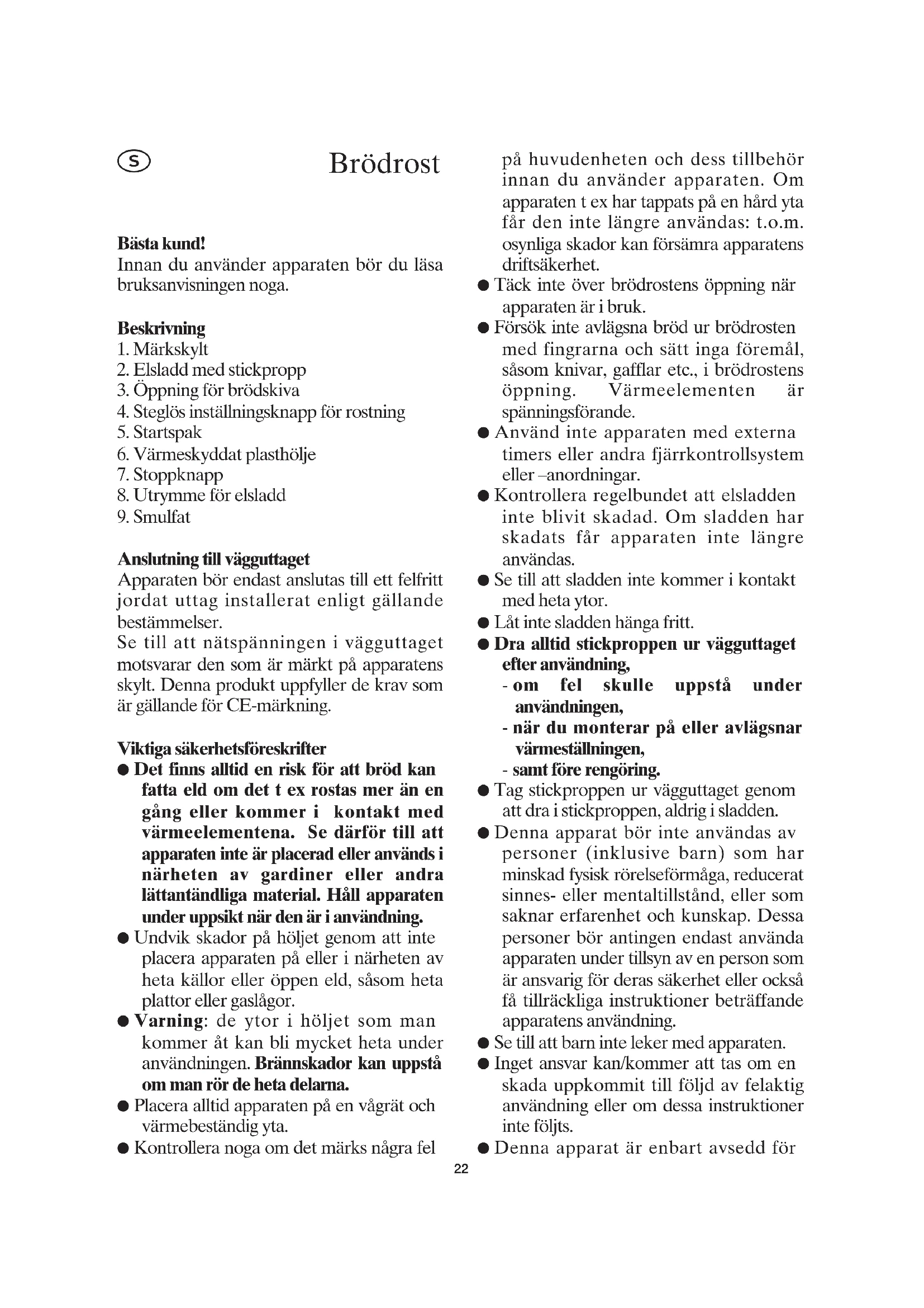 Anslutning till vägguttaget Apparaten bör endast anslutas till ett felfritt jordat uttag installerat enligt gällande bestämmelser. Se till att nätspänningen i vägguttaget motsvarar den som är märkt på apparatens skylt. Denna produkt uppfyller de krav som är gällande för CE-märkning. Viktiga säkerhetsföreskrifter ● Det finns alltid en risk för att bröd kan fatta eld om det t ex rostas mer än en gång eller kommer i kontakt med värmeelementena. Se därför till att apparaten inte är placerad eller används i närheten av gardiner eller andra lättantändliga material. Håll apparaten under uppsikt när den är i användning. ● Undvik skador på höljet genom att inte placera apparaten på eller i närheten av heta källor eller öppen eld, såsom heta plattor eller gaslågor. ● Varning: de ytor i höljet som man kommer åt kan bli mycket heta under användningen. Brännskador kan uppstå om man rör de heta delarna. ● Placera alltid apparaten på en vågrät och värmebeständig yta. ● Kontrollera noga om det märks några fel på huvudenheten och dess tillbehör innan du använder apparaten. Om apparaten t ex har tappats på en hård yta får den inte längre användas: t.o.m. osynliga skador kan försämra apparatens driftsäkerhet. ● Täck inte över brödrostens öppning när apparaten är i bruk. ● Försök inte avlägsna bröd ur brödrosten med fingrarna och sätt inga föremål, såsom knivar, gafflar etc., i brödrostens öppning. Värmeelementen är spänningsförande. ● Använd inte apparaten med externa timers eller andra fjärrkontrollsystem eller –anordningar. ● Kontrollera regelbundet att elsladden inte blivit skadad. Om sladden har skadats får apparaten inte längre användas. ● Se till att sladden inte kommer i kontakt med heta ytor. ● Låt inte sladden hänga fritt. ● Dra alltid stickproppen ur vägguttaget efter användning, - om fel skulle uppstå under användningen, - när du monterar på eller avlägsnar värmeställningen, - samt före rengöring. ● Tag stickproppen ur vägguttaget genom att dra i stickproppen, aldrig i sladden. ● Denna apparat bör inte användas av personer (inklusive barn) som har minskad fysisk rörelseförmåga, reducerat sinnes- eller mentaltillstånd, eller som saknar erfarenhet och kunskap. Dessa personer bör antingen endast använda apparaten under tillsyn av en person som är ansvarig för deras säkerhet eller också få tillräckliga instruktioner beträffande apparatens användning. ● Se till att barn inte leker med apparaten. ● Inget ansvar kan/kommer att tas om en skada uppkommit till följd av felaktig användning eller om dessa instruktioner inte följts. ● Denna apparat är enbart avsedd för