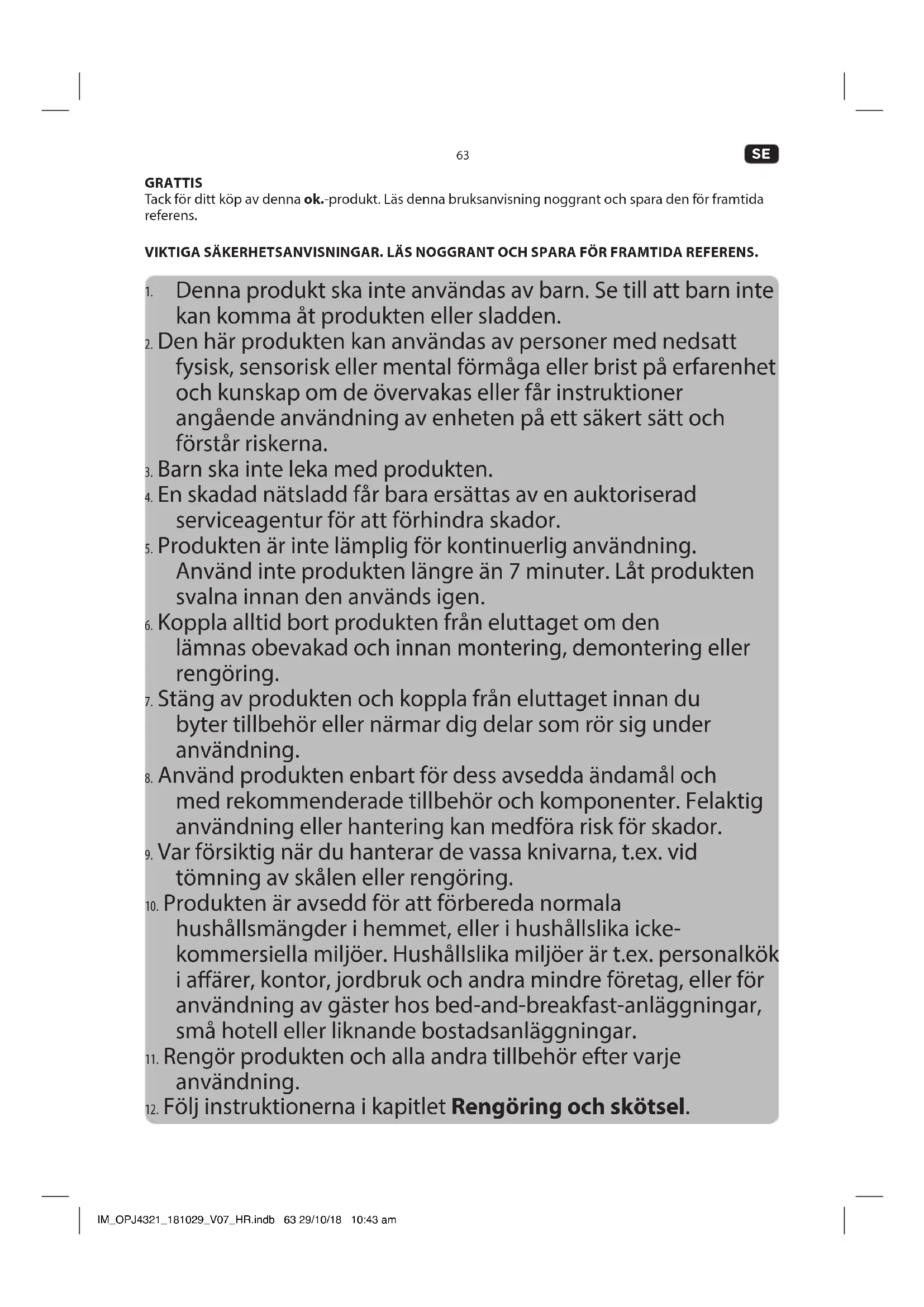 - Byt till en lägre hastighet SPECIFIKATION Märkspänning : 220 - 240 V~, 50/60 Hz Märkeekt : 1000 W Skyddsklass : II AVYTTRING Denna apparat får inte kastas med hushållsavfallet. Lämna in den på återvinningsstationen för återvinning av elektroniskt och elektriskt avfall. Genom att göra detta hjälper du till att bevara resurserna och skydda miljön. Kontakta din återförsäljare eller lokala myndigheter för mer information. IM_OPJ4321_181029_V07_HR.indb 68 29/10/18 10:43 am69
