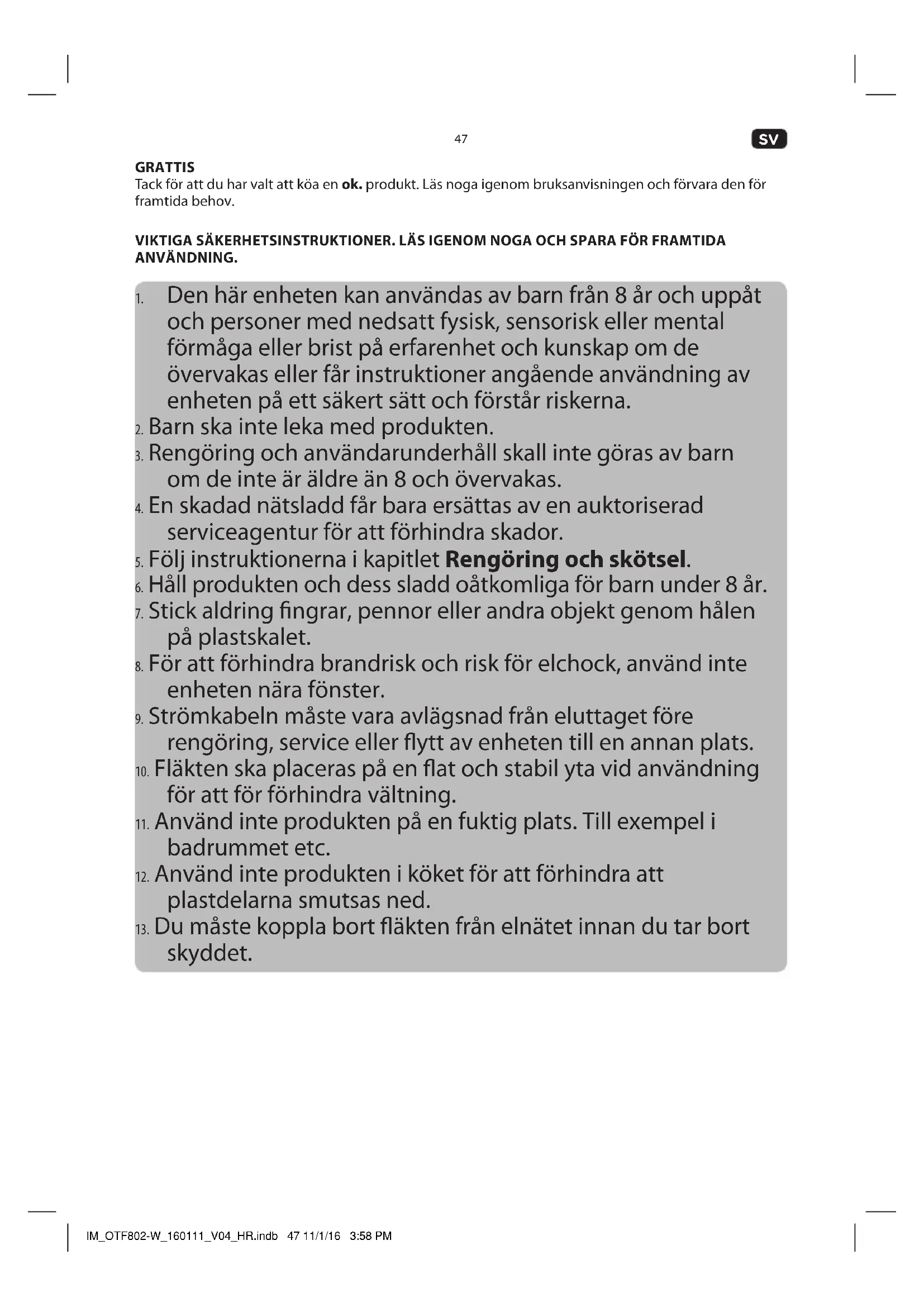 GRATTIS Tack för att du har valt att köa en ok. produkt. Läs noga igenom bruksanvisningen och förvara den för framtida behov. VIKTIGA SÄKERHETSINSTRUKTIONER. LÄS IGENOM NOGA OCH SPARA FÖR FRAMTIDA ANVÄNDNING.
