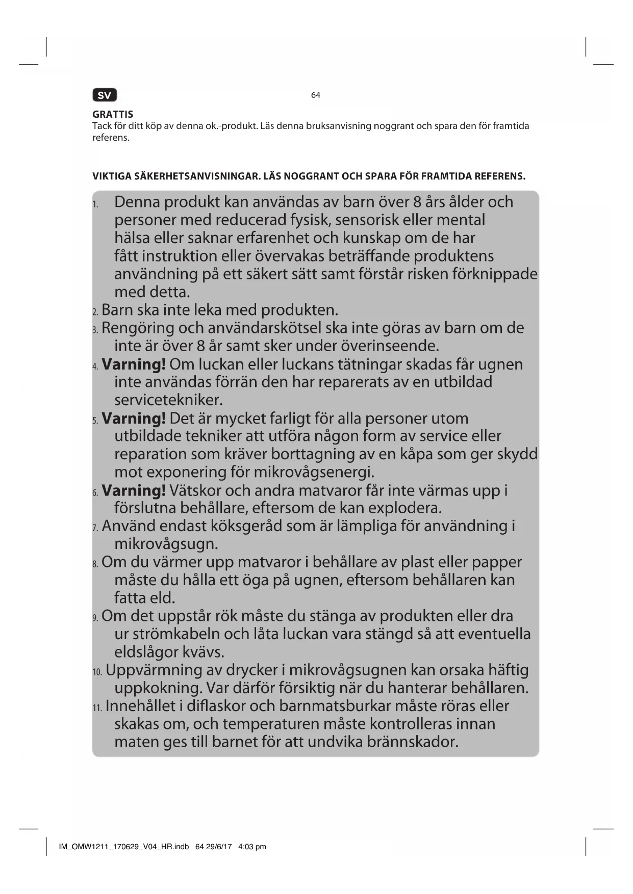 Denna produkt är avsedd för upptining, återuppvärmning och tillagning av matvaror. All annan användning kan leda till skador på produkten eller personskador. Imtron GmbH tar inget ansvar för skador på produkten, för skador på egendom eller personskador på grund av vårdslös eller felaktig användning av produkten eller användning av produkten som inte uppfyller tillverkarens angivna ändamål. IM_OMW1211_170629_V04_HR.indb 66 29/6/17 4:03 pm67