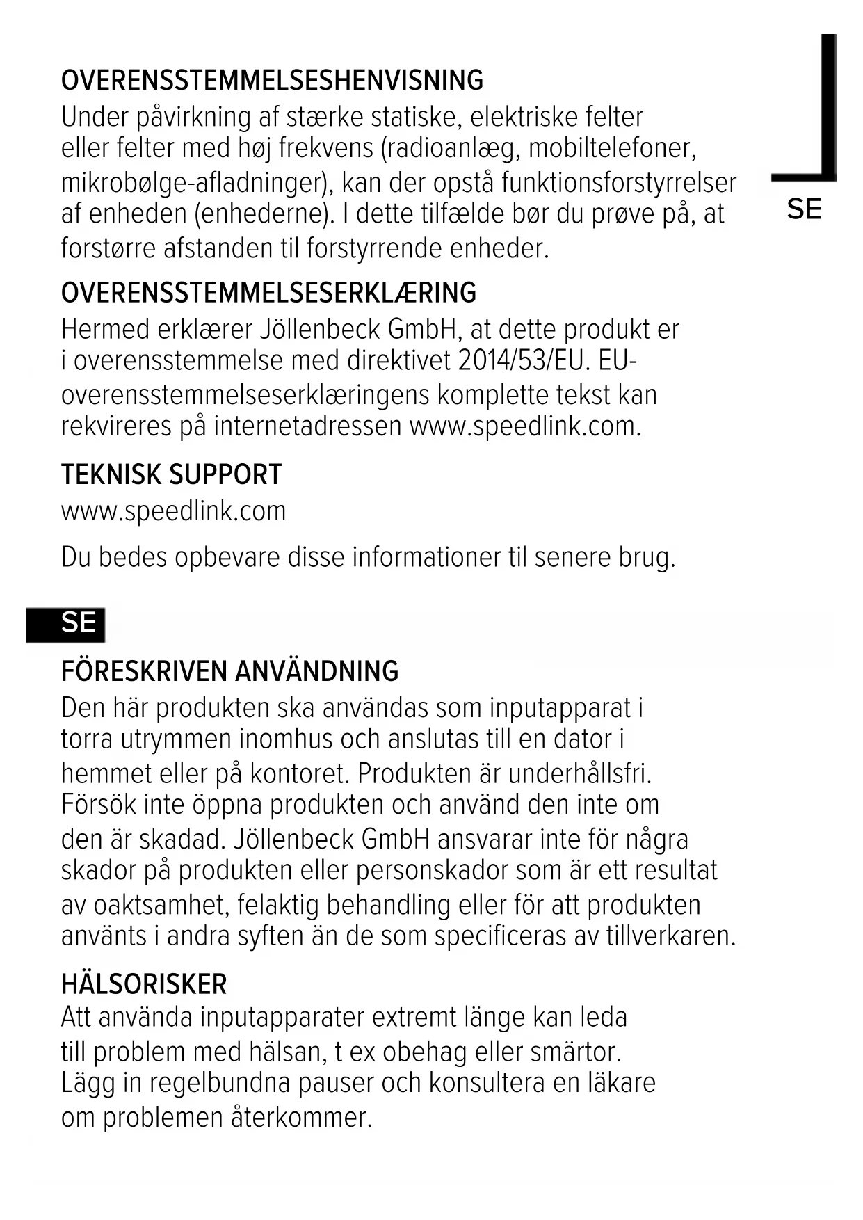 Jöllenbeck GmbH försäkrar att den här produkten uppfyller de relevanta säkerhetskraven i EU-direktiv 2014/53/EU. En fullständig försäkran om överensstämmelse kan beställas på vår webbsida under www.speedlink.com.NO TEKNISK SUPPORT www.speedlink.com Spara den här informationen för senare bruk.