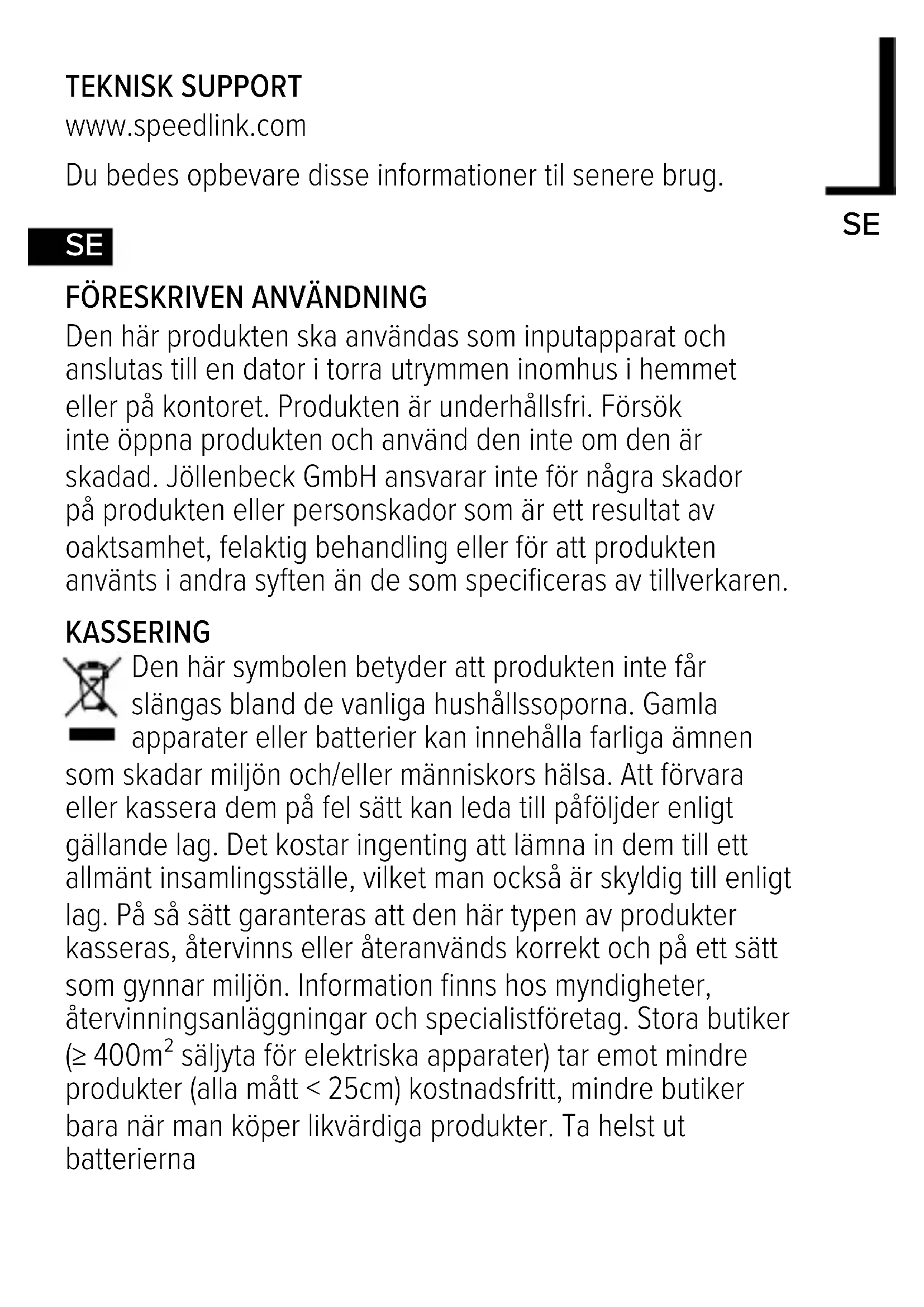 Den här produkten ska användas som inputapparat och anslutas till en dator i torra utrymmen inomhus i hemmet eller på kontoret. Produkten är underhållsfri. Försök inte öppna produkten och använd den inte om den är skadad. Jöllenbeck GmbH ansvarar inte för några skador på produkten eller personskador som är ett resultat av oaktsamhet, felaktig behandling eller för att produkten använts i andra syften än de som specificeras av tillverkaren. KASSERING Den här symbolen betyder att produkten inte får slängas bland de vanliga hushållssoporna. Gamla apparater eller batterier kan innehålla farliga ämnen som skadar miljön och/eller människors hälsa. Att förvara eller kassera dem på fel sätt kan leda till påföljder enligt gällande lag. Det kostar ingenting att lämna in dem till ett allmänt insamlingsställe, vilket man också är skyldig till enligt lag. På så sätt garanteras att den här typen av produkter kasseras, återvinns eller återanvänds korrekt och på ett sätt som gynnar miljön. Information finns hos myndigheter, återvinningsanläggningar och specialistföretag. Stora butiker (≥ 400m² säljyta för elektriska apparater) tar emot mindre produkter (alla mått < 25cm) kostnadsfritt, mindre butiker bara när man köper likvärdiga produkter. Ta helst ut batteriernaINFORMATION OM BATTERIER Den här produkten drivs med alkaliska manganceller. Endast den typen av batterier får användas. Byt genast ut gamla/urladdade batterier, ladda inte upp dem igen. Förvara batterier på ett torrt ställe utom räckhåll för barn. Får inte kastas i en eld eller utsättas för höga temperaturer.