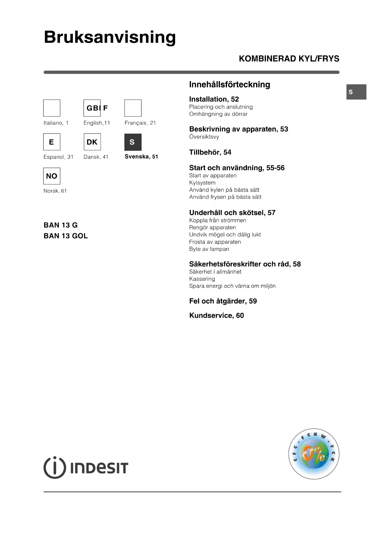 Hitta enhetens manual gratis BAN 13 GOL INDESIT i PDF-format.