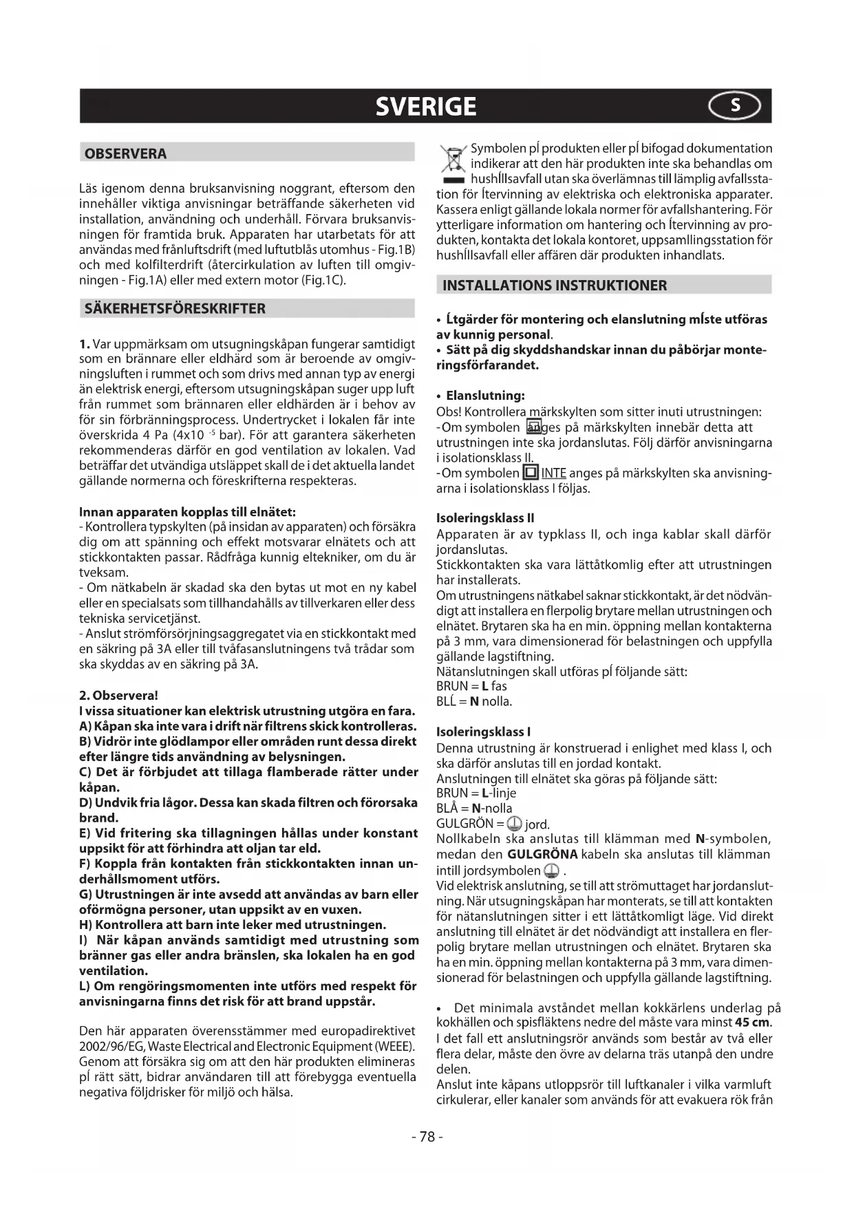 bränner gas eller andra bränslen, ska lokalen ha en god ventilation. L) Om rengöringsmomenten inte utförs med respekt för anvisningarna finns det risk för att brand uppstår. Den här apparaten överensstämmer med europadirektivet 2002/96/EG, Waste Electrical and Electronic Equipment (WEEE). Genom att försäkra sig om att den här produkten elimineras pĺ rätt sätt, bidrar användaren till att förebygga eventuella negativa följdrisker för miljö och hälsa. Symbolen pĺ produkten eller pĺ bifogad dokumentation indikerar att den här produkten inte ska behandlas om hushĺllsavfall utan ska överlämnas till lämplig avfallssta- tion för ĺtervinning av elektriska och elektroniska apparater. Kassera enligt gällande lokala normer för avfallshantering. För ytterligare information om hantering och ĺtervinning av pro- dukten, kontakta det lokala kontoret, uppsamllingsstation för hushĺllsavfall eller affären där produkten inhandlats. INSTALLATIONS INSTRUKTIONER