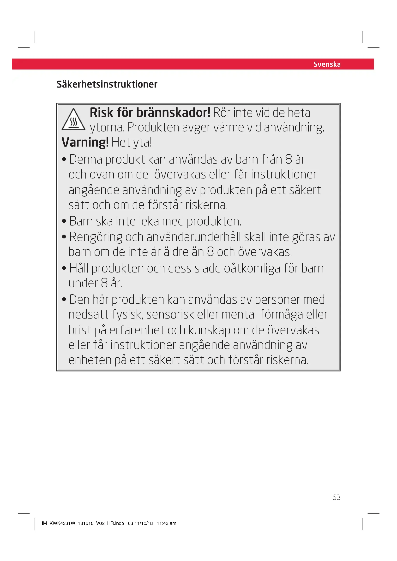 - Den här produkten kan användas av personer med nedsatt fysisk, sensorisk eller mental förmåga eller brist på erfarenhet och kunskap om de övervakas eller får instruktioner angående användning av enheten på ett säkert sätt och förstår riskerna. IM_KWK4331W_181010_V02_HR.indb 63 11/10/18 11:43 amSize - A5 Svenska