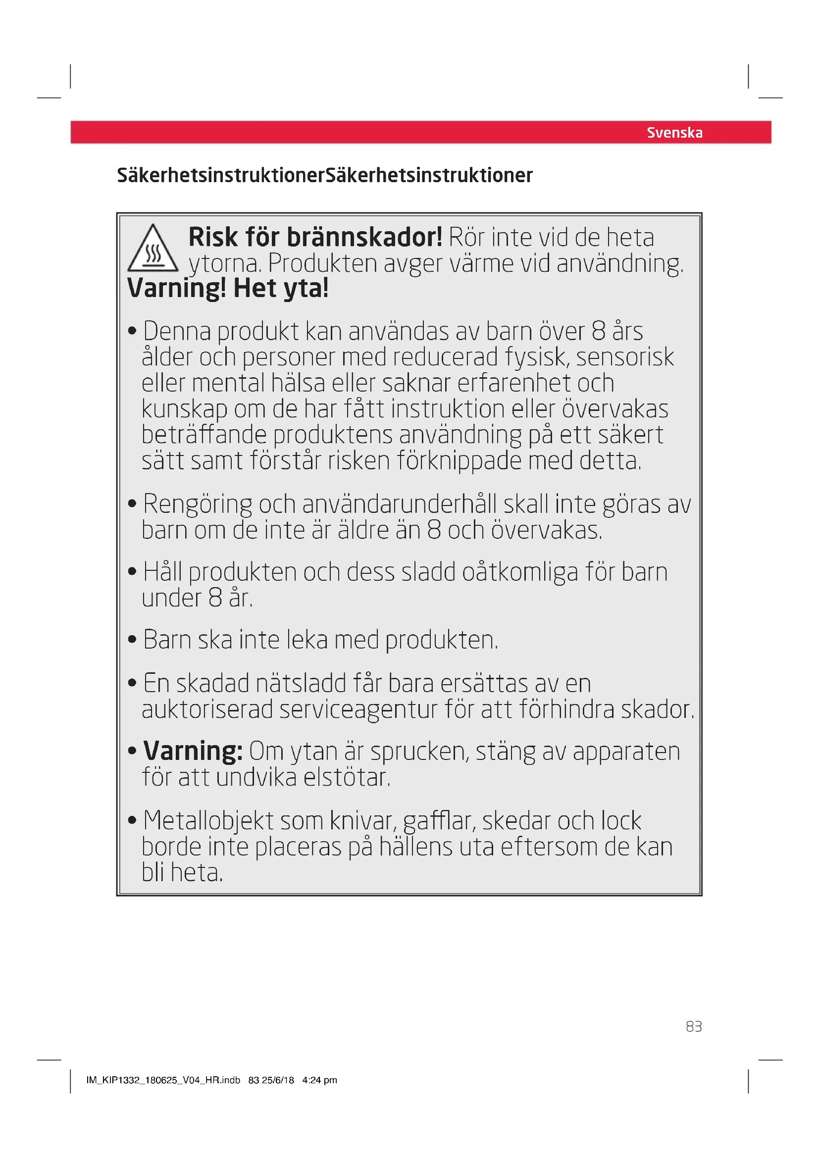 - Metallobjekt som knivar, gaar, skedar och lock borde inte placeras på hällens uta eftersom de kan bli heta. IM_KIP1332_180625_V04_HR.indb 83 25/6/18 4:24 pmSvenska