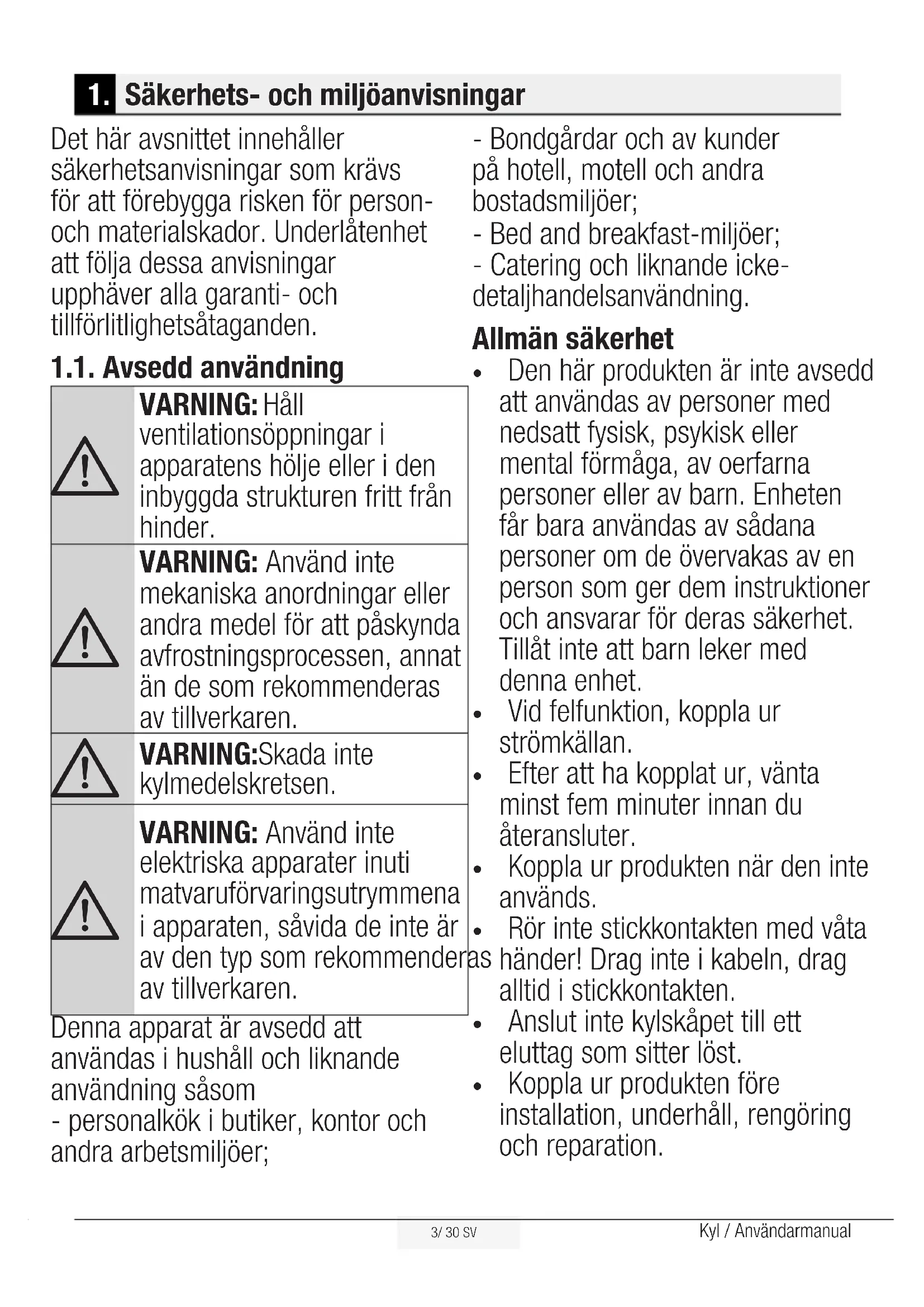 - Tillverkaren ansvarar inte för eventuella skador på grund av felaktig användning eller felhantering.6 / 30 SV Kyl / Användarmanual Säkerhets- och miljöinstruktioner